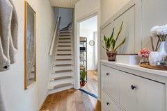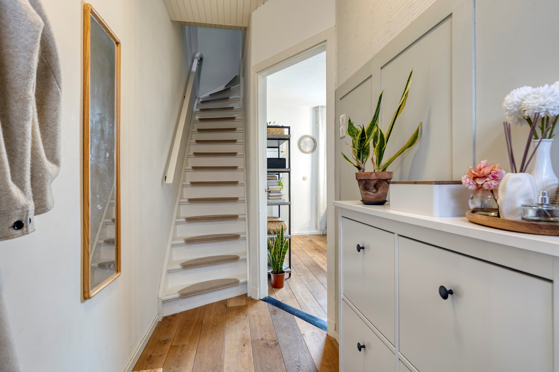 De karakteristieke voordeur verwelkomt je als een warme handdruk. Zodra je de hal binnenstapt, valt het zachte daglicht door de vensters van het bovenlicht naar binnen. Het voelt warm, uitnodigend — als thuiskomen na een lange dag.