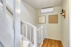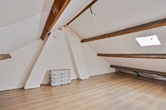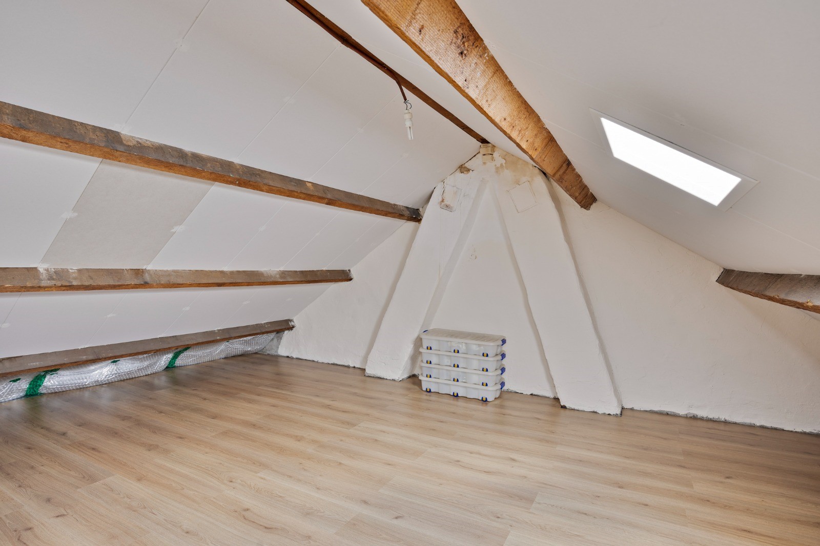 Via de vaste trap bereik je een ruime zolderruimte met houtlook laminaatvloer en twee dakramen die het daglicht rijkelijk binnenlaten. Het is de perfecte plek voor opslag, hobby’s of misschien wel een toekomstige werkplek.