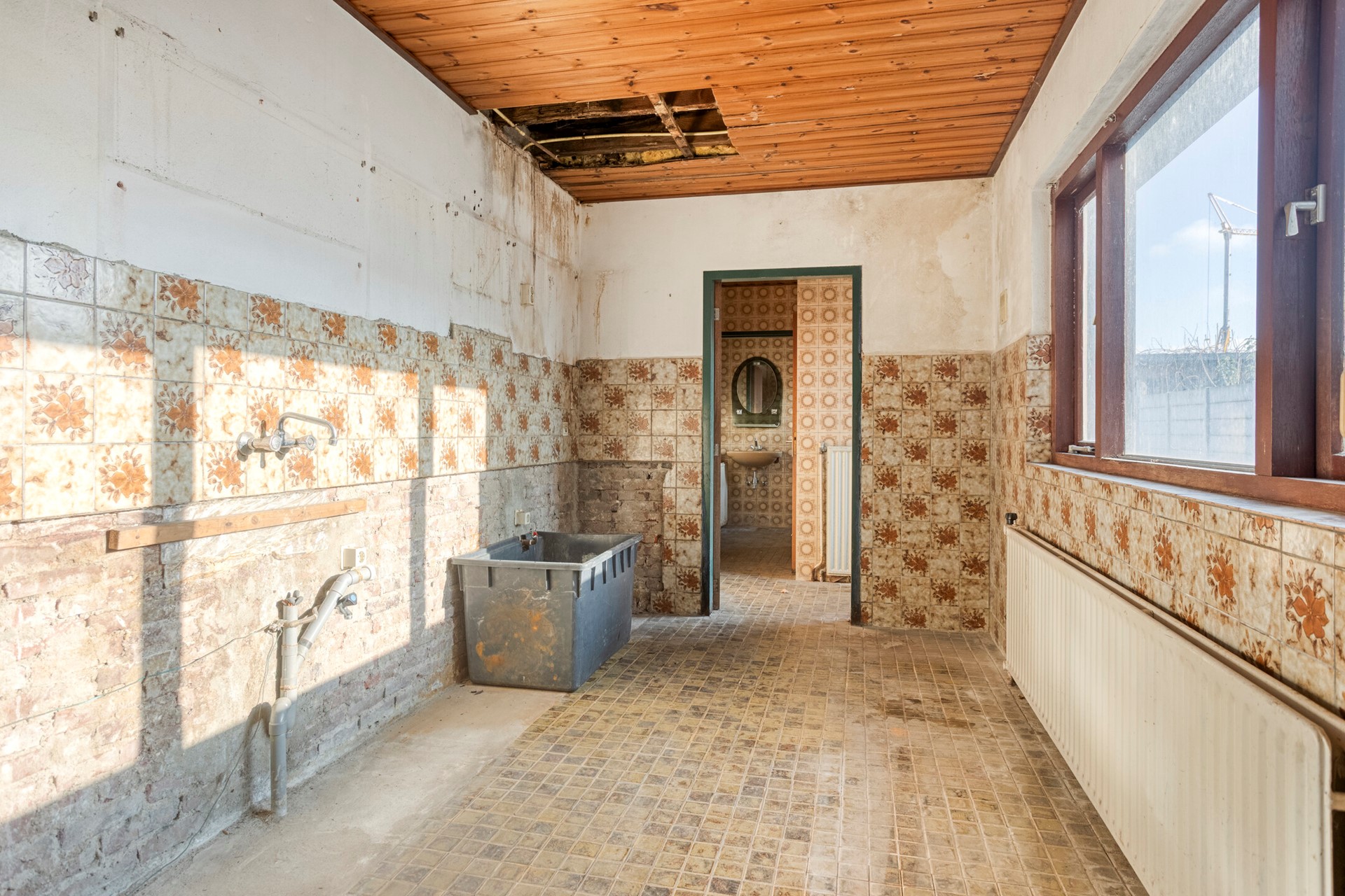 Aan de achterzijde van de woning vind je de keuken. Momenteel eenvoudig en gedateerd, maar met verrassend veel mogelijkheden. Hier kun je werkelijk alle kanten op: van een lichte leefkeuken tot een compacte, moderne werkruimte — de plek is er.