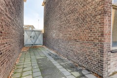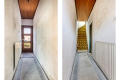 Achter de keuken bevindt zich een kleine hal die toegang biedt tot het toilet, de badkamer én de achterdeur naar de tuin.