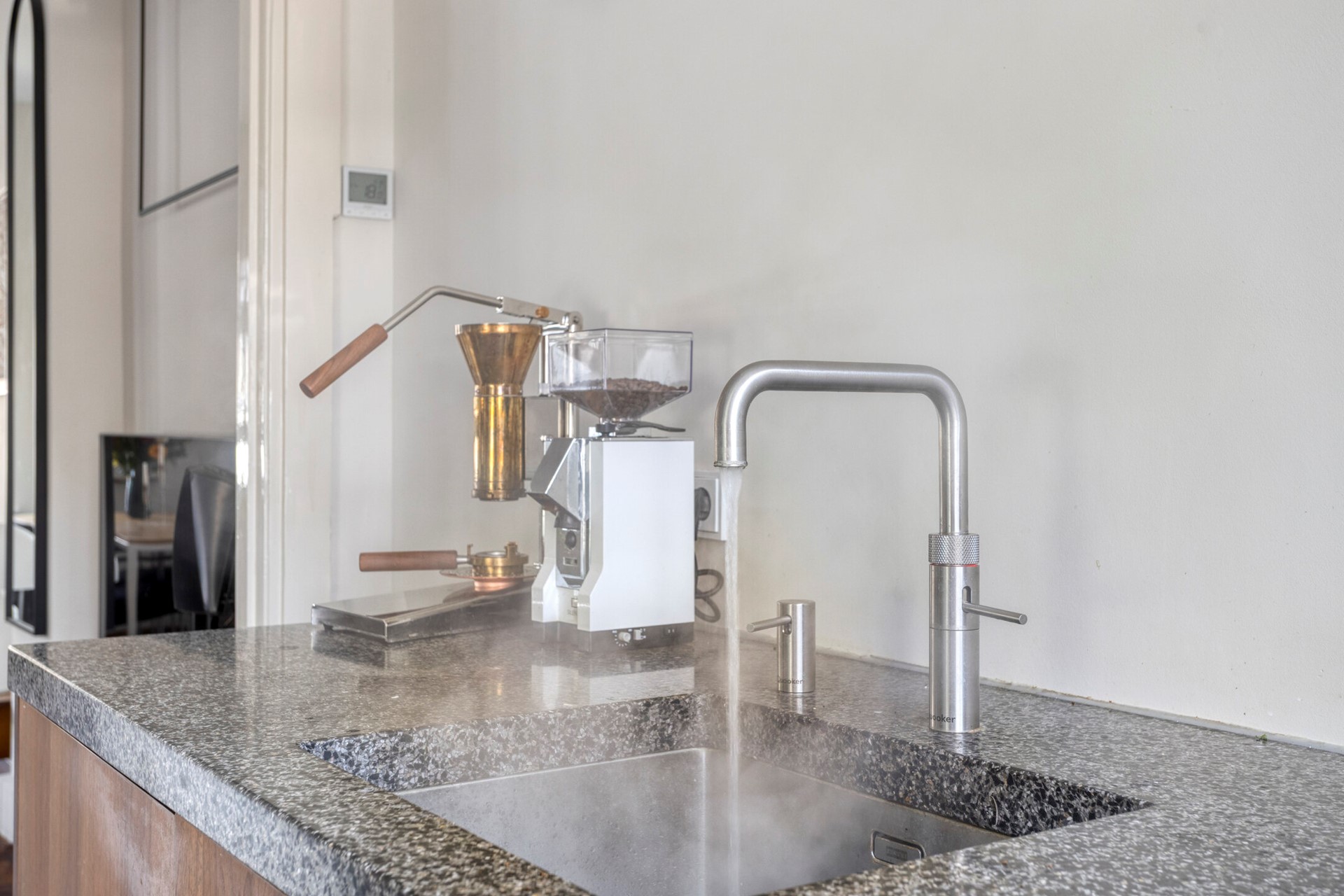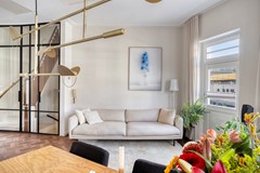 De sfeervolle woonkamer op de eerste verdieping vormt het kloppend hart van de woning. Hoge plafonds, strak gestucte wanden en een overvloed aan licht zorgen voor een ruimtelijk gevoel. Vanuit hier kijk je uit over het gezellige Radiopleintje — een levend schilderij dat elk moment van de dag een andere sfeer met zich meebrengt. Aan de voorzijde bevindt zich een charmant stadsbalkon, terwijl je aan de achterzijde een heerlijk dakterras vindt, grenzend aan de keuken.