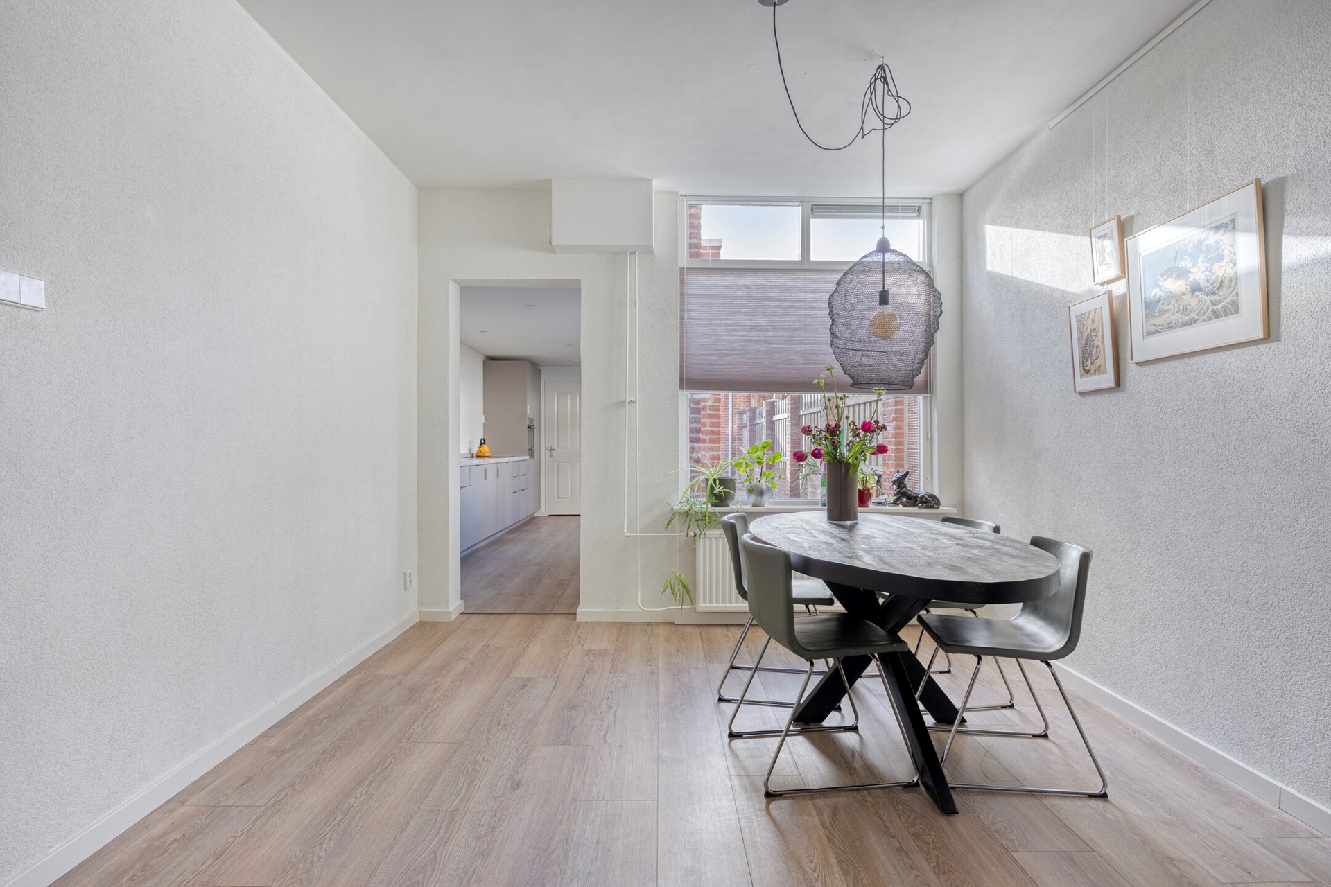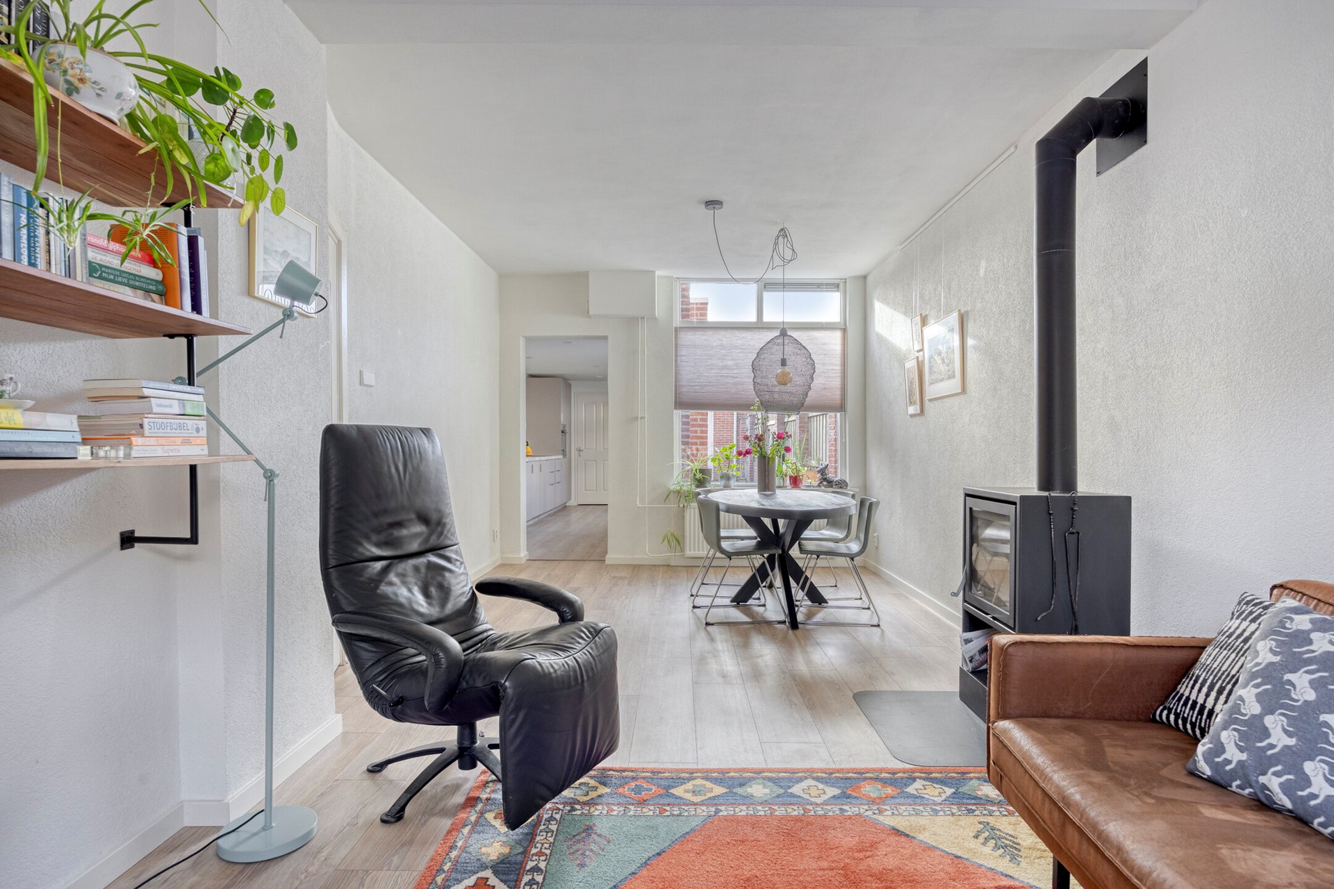 De woonkamer is royaal en licht, met ruimte voor een grote zithoek en een gezellige eettafel. Het grote raam in de achtergevel brengt de buitenwereld naar binnen, terwijl de moderne zwarte houtkachel zorgt voor een warme, knusse sfeer. De houtlook laminaatvloer (2024) maakt het plaatje compleet en biedt een tijdloze uitstraling.