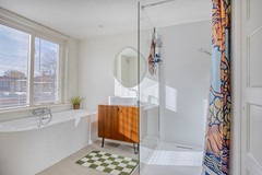 Op de eerste verdieping bevinden zich twee sfeervolle slaapkamers, netjes afgewerkt met een houtlook laminaatvloer. De volledig vernieuwde badkamer (2024) is een oase van rust, met ligbad, inloopdouche, designradiator en een stijlvol meubel met waskom. Hier kunt u na een drukke dag optimaal ontspannen.