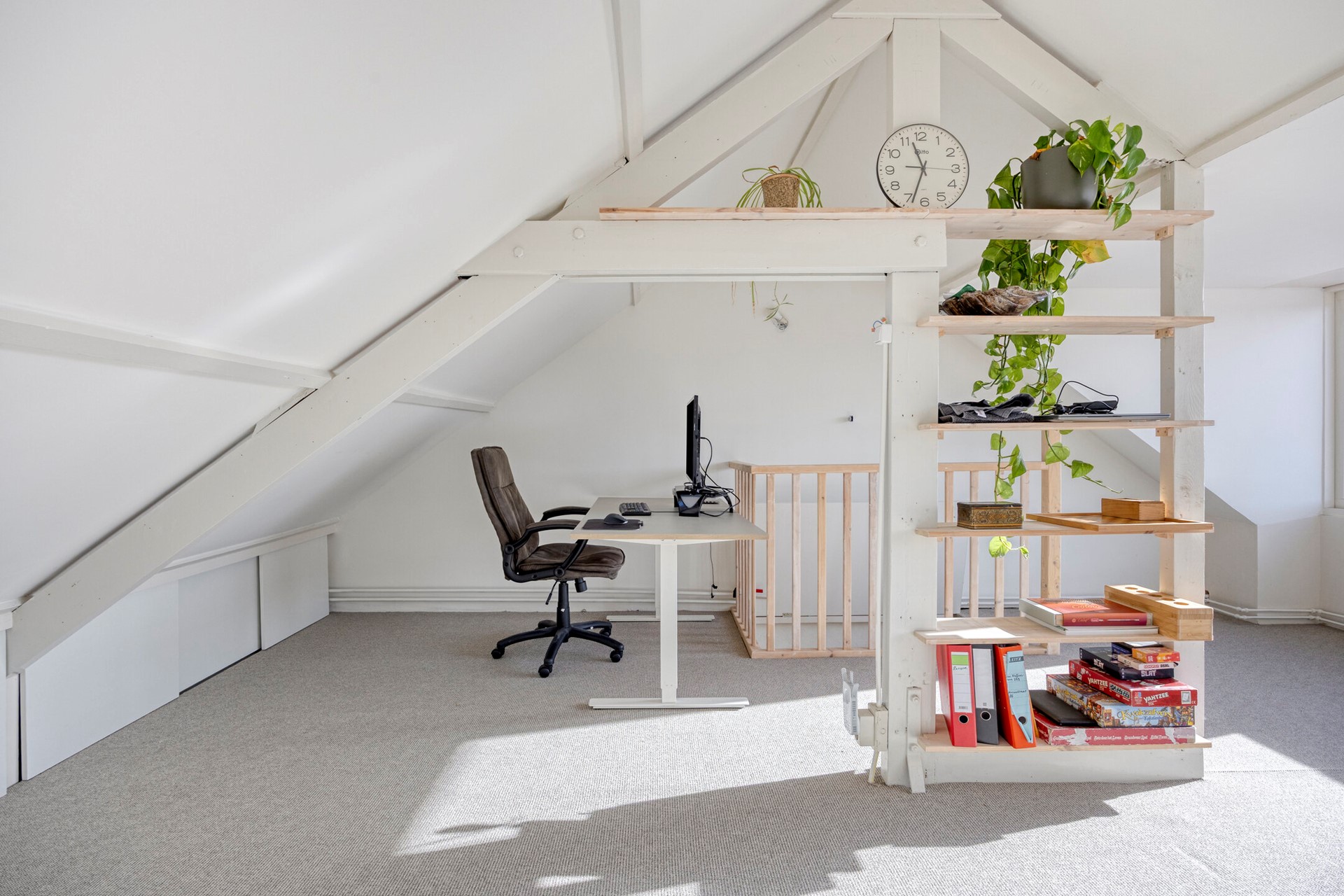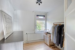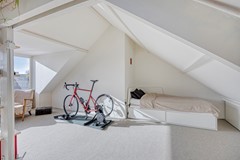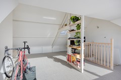 De zolderkamer op de tweede verdieping is een echte sfeermaker. De hoge ruimte met grote dakkapel en zichtbare spantenconstructie biedt een inspirerende plek voor werk, hobby of ontspanning.