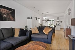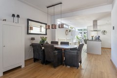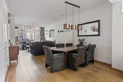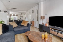 De woonkamer verwelkomt je met zijn prachtige houten vloer, hoge plafonds en de speelse lichtinval die via de ramen binnenvalt. Het is zo’n ruimte waar je meteen rustig van wordt. Een royale zithoek aan de voorzijde, een sfeervolle eethoek richting de keuken: alles ademt balans en gezelligheid. Dit is een woonkamer waar je samenkomt, leeft, lacht en geniet.