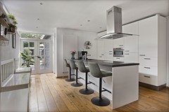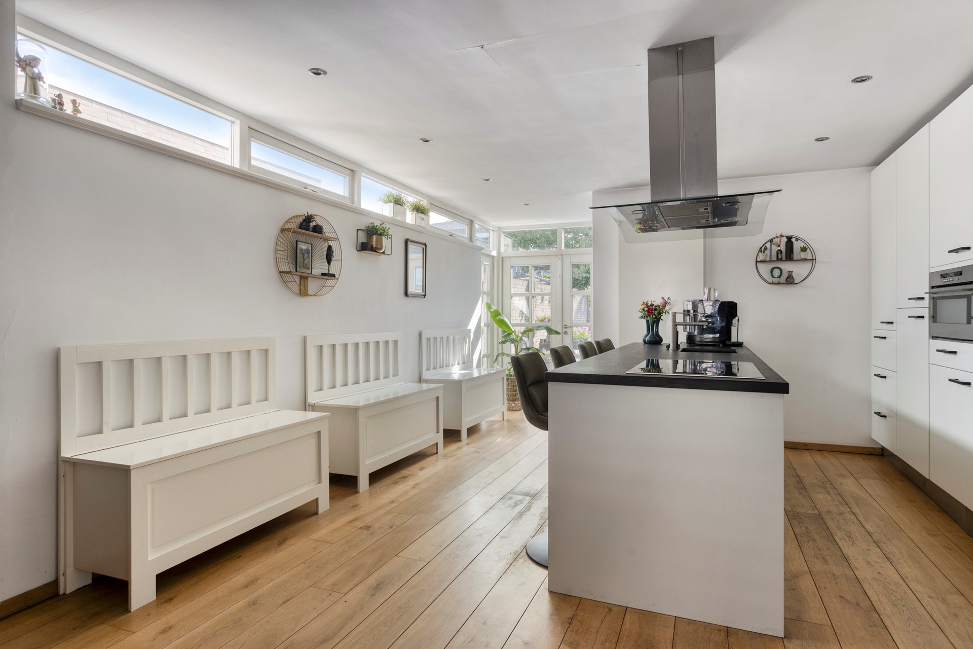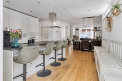 De woonkeuken is zonder twijfel het pronkstuk van dit huis. Een heerlijke plek waar design en functionaliteit hand in hand gaan. Het kookeiland met bar vormt het centrum van het dagelijks leven — hier worden ontbijten gedeeld, drankjes ingeschonken en plannen gesmeed. De stijlvolle kastenwand biedt alle ruimte, terwijl de moderne apparatuur uitnodigt tot culinair experiment. Het daglicht stroomt binnen via de zijramen, en met de openslaande tuindeuren betrek je in één beweging binnen met buiten.