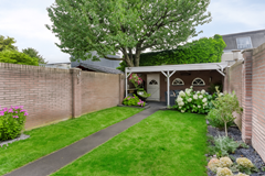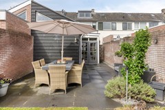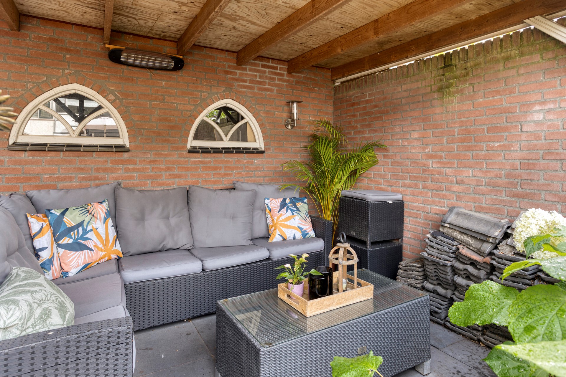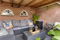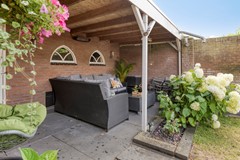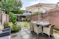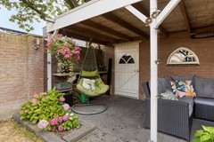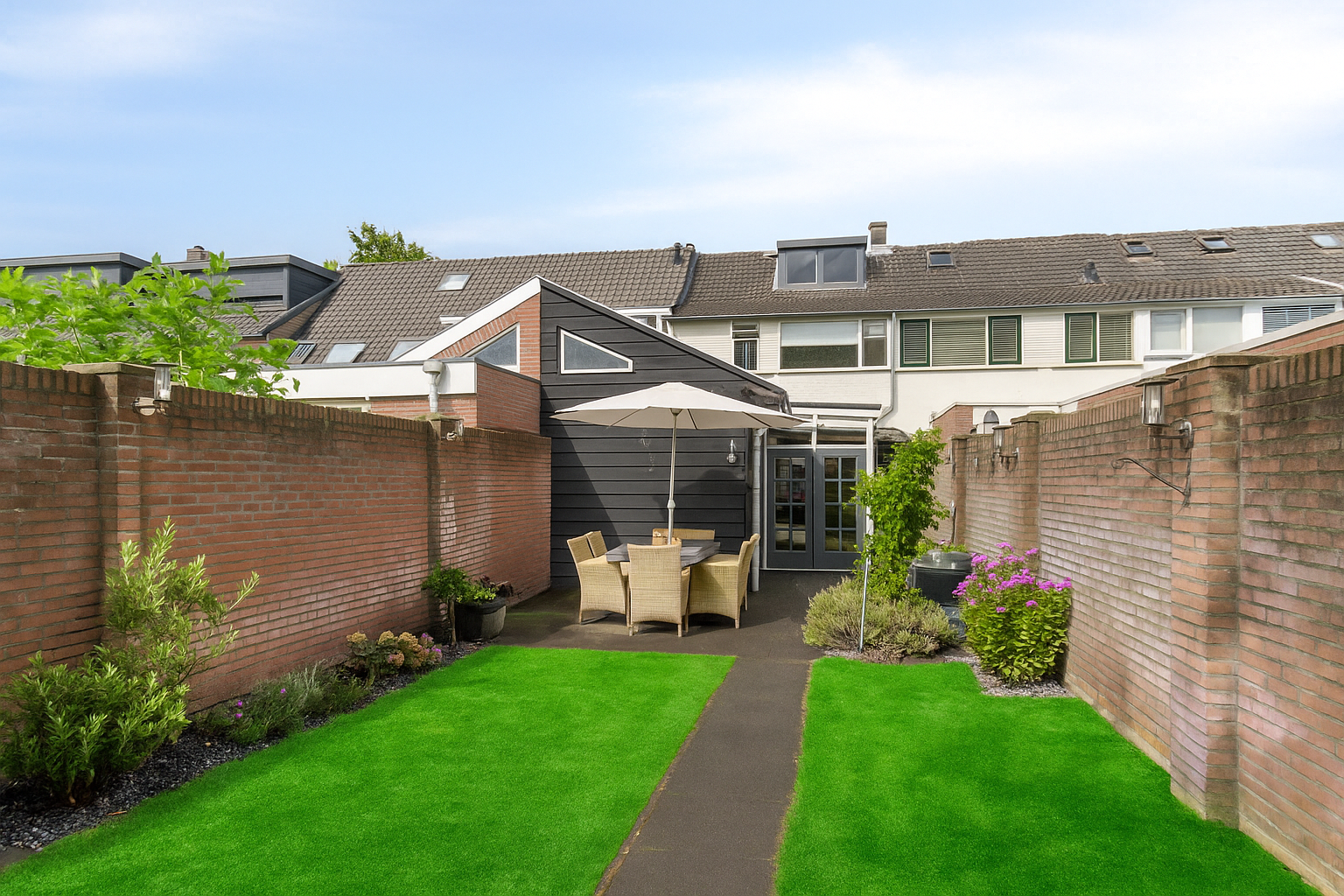 Achter de woning ligt een heerlijke tuin op het oosten, waar je de dag begint met een kop koffie in de ochtendzon en eindigt met een lekker drankje onder de overkapping. Het ruime terras, het gazon en de stenen berging maken het plaatje compleet. Dankzij de ligging geniet je hier de hele dag van zowel zon als schaduw – precies zoals jij het wilt.