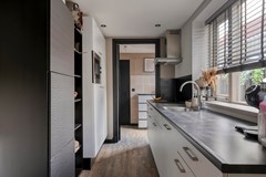 De keuken (2023) is strak wit met een donker werkblad, voorzien van een spoelbak, vaatwasser en inductiekookplaat. Aan de andere zijde vind je een grote kastenwand met combi-oven, koel-/vriescombinatie en veel bergruimte. Hier bereid je niet alleen de lekkerste gerechten, maar geniet je ook van de praktische indeling en moderne uitstraling.