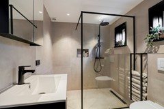 De badkamer (2023) straalt luxe uit met grote beige tegels, stijlvolle zwarte accenten en een ruime inloopdouche met regendouche. Het moderne wastafelmeubel met spiegelkast en het toilet maken de ruimte helemaal compleet. Een plek waar je de dag heerlijk kunt beginnen én afsluiten.