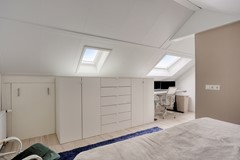Op de zolder bevindt zich een praktische voorzolder met een fijne werkplek voor thuiswerken en veel opslagruimte dankzij knieschotten. Drie dakramen laten volop daglicht binnen en geven een ruimtelijk gevoel. Ook hier is de omvormer van de zonnepanelen geplaatst.