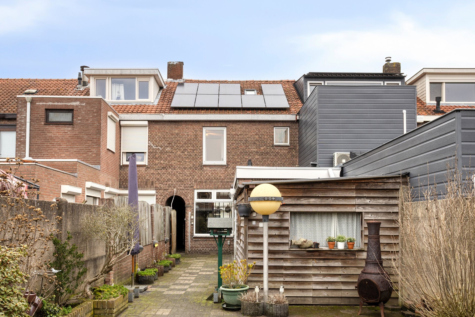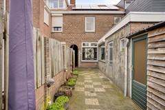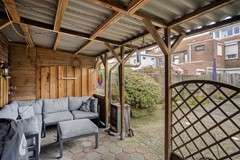 De diepe achtertuin, gelegen op het zuiden, met overkapping en elektra is een heerlijke plek om te ontspannen of te genieten van gezellige zomeravonden. Een aangebouwde stenen schuur biedt extra opslag en praktische ruimte voor fietsen, tuinspullen of een hobby.Via de poort aan de straatzijde bereik je de zijgang, die wordt gedeeld met de aangrenzende buren. Vanuit hier beschikt iedere woning over een eigen afsluitbare poort naar de tuin. Ideaal voor het gemakkelijk stallen van fietsen, of lichte motor.