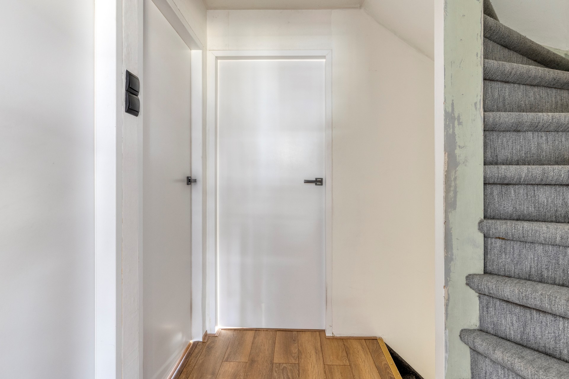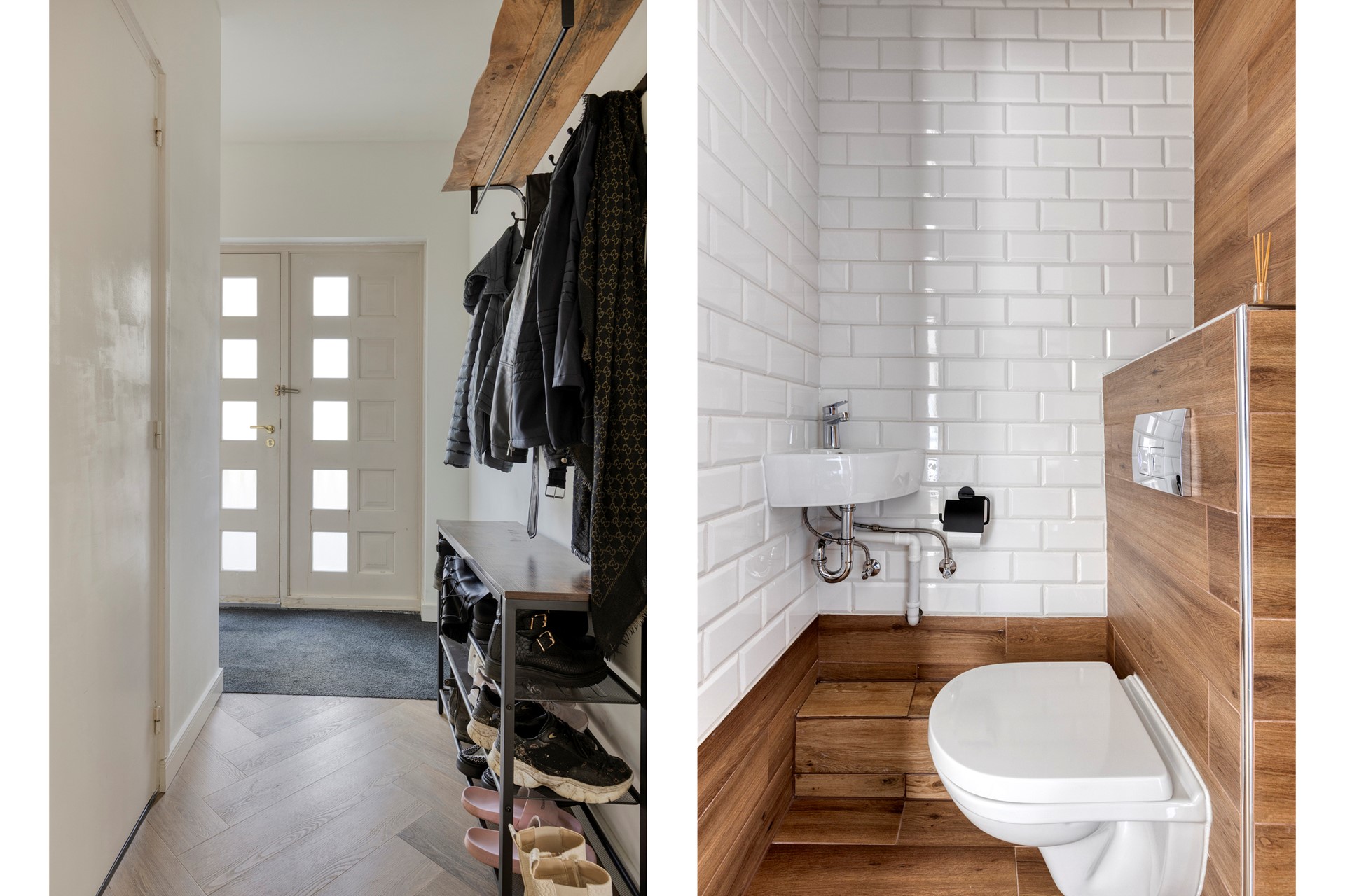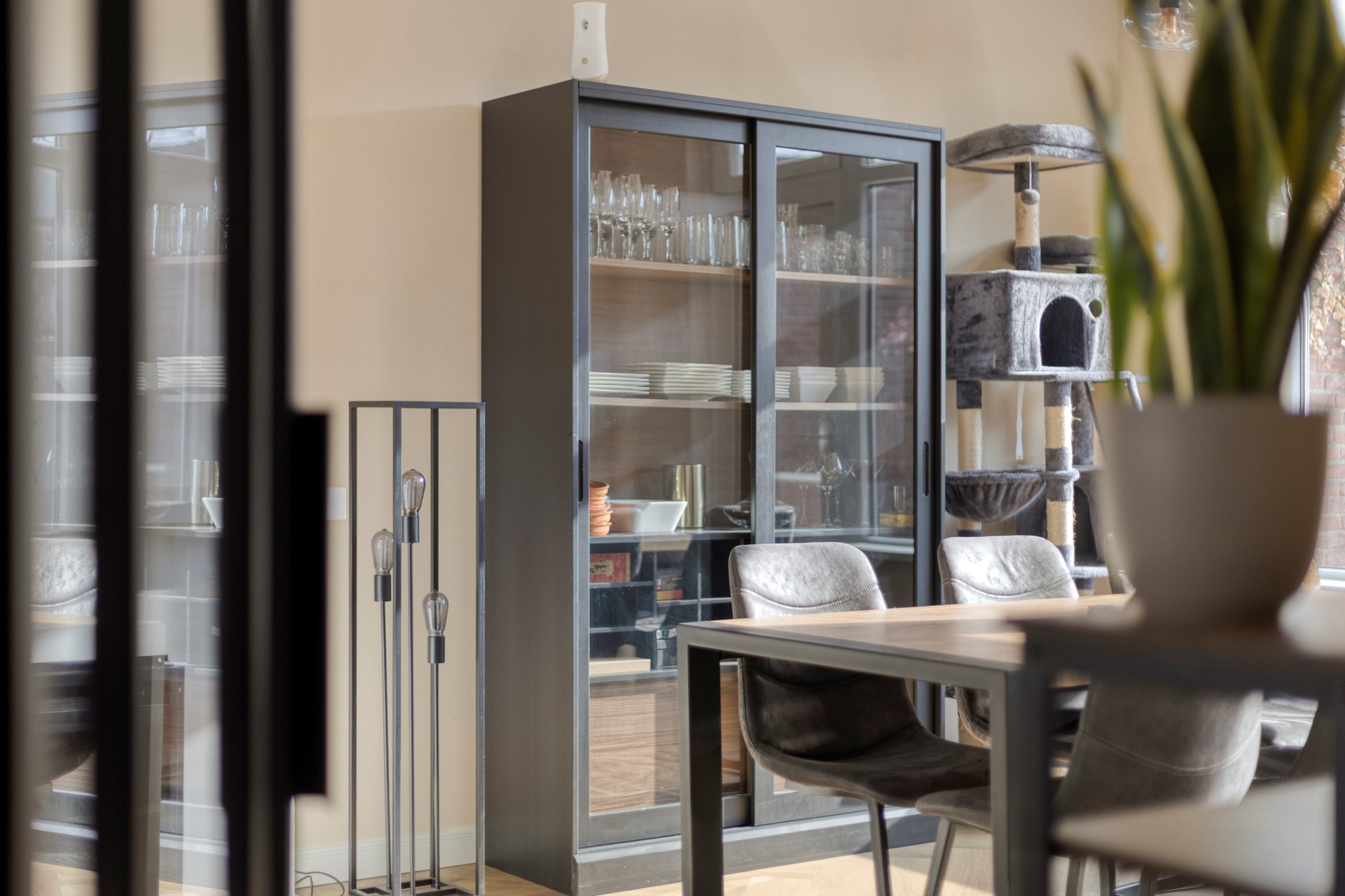 Binnen wordt u direct verrast door de royale, volledig vernieuwde leefruimte. Hier komen sfeer en modern wooncomfort perfect samen. De visgraat PVC-vloer met vloerverwarming voelt aangenaam warm aan en vormt een stijlvolle basis voor ieder interieur. Strakke wanden, een prachtige zwarte stalen deur en de elektrische haard zorgen voor een eigentijdse, luxe uitstraling met een warme ambiance. De grote raampartijen aan voor- en achterzijde laten het daglicht rijkelijk binnenstromen en verbinden binnen moeiteloos met buiten.