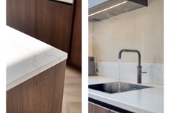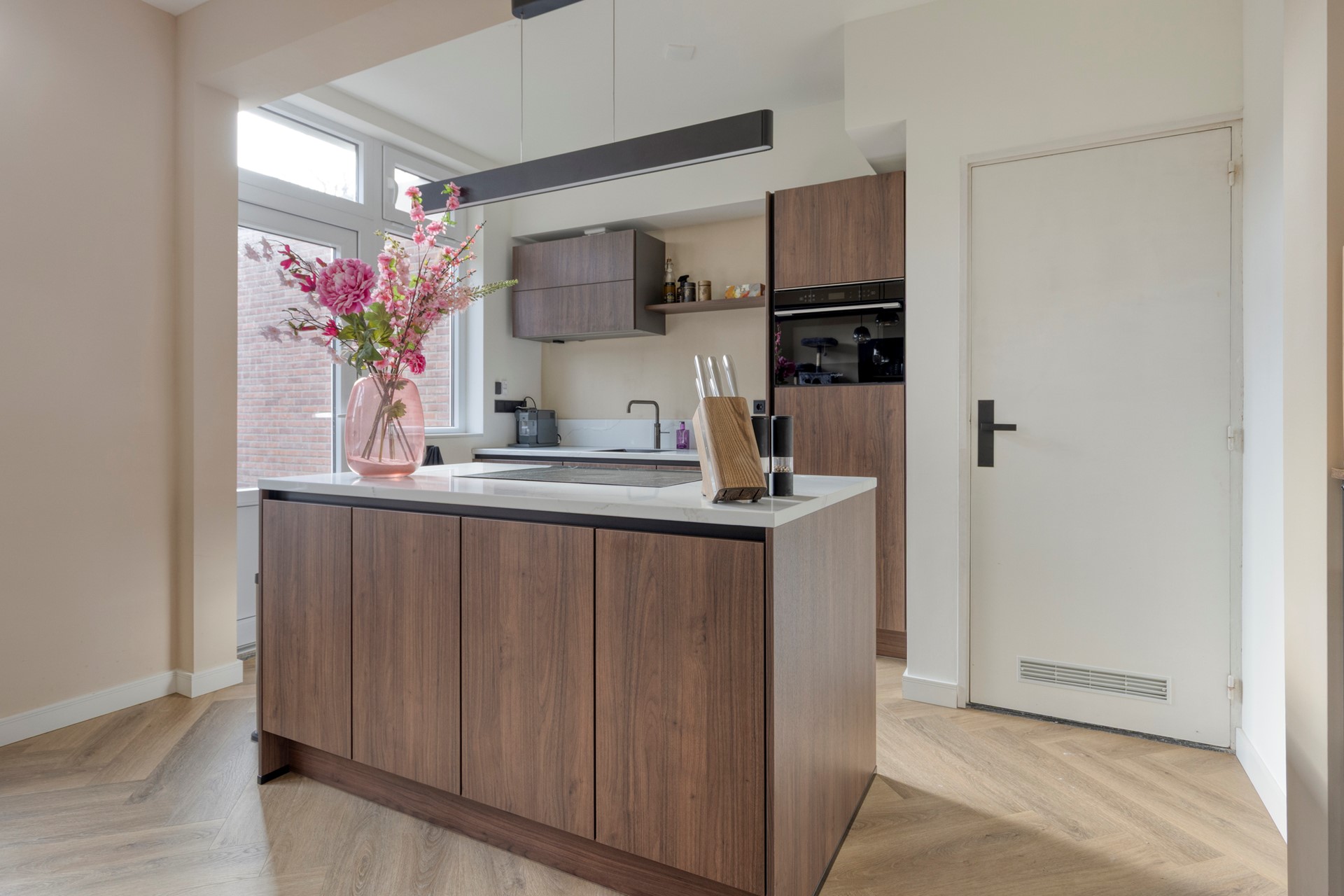 De open keuken vormt een echte eyecatcher. Het warme houttint keukenmeubel in combinatie met het lichte werkblad geeft een tijdloze, elegante uitstraling. De keuken is niet alleen een lust voor het oog, maar ook volledig uitgerust met hoogwaardige inbouwapparatuur die koken tot een echte beleving maakt. Zo beschikt het kookeiland over een moderne kookplaat met geïntegreerde kookveldafzuiging van BORA, waardoor u geniet van een strak design zonder zichtbare afzuigkap. Daarnaast is de keuken voorzien van een Quooker (de kraan die alles kan), een vaatwasser, een koelkast en een combi-oven op comfortabele ooghoogte — praktisch, stijlvol en helemaal van deze tijd. Hier kookt u met gemak, terwijl u in contact blijft met uw gezelschap.