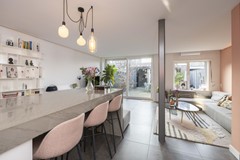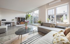 De woonkamer voelt ruim, licht en uitnodigend. Grote raampartijen zorgen voor een prettige lichtinval en versterken het gevoel van ruimte. Hier is plek om samen te zijn, maar ook om je even terug te trekken. Een fijne balans tussen openheid en geborgenheid, precies wat je zoekt in een echt thuis.