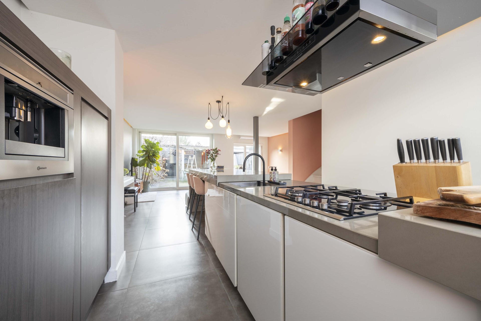 De luxe keuken is zonder twijfel het middelpunt van de woning. Het royale kook- en spoeleiland nodigt uit tot samenkomen: koken, borrelen en lange avonden met familie en vrienden. De kastenwand met hoogwaardige Bauknecht-inbouwapparatuur — waaronder een magnetron/combi-oven op ooghoogte én een ingebouwd koffiezetapparaat — maakt het geheel compleet. Dit is een keuken die niet alleen mooi is, maar vooral sfeer brengt.