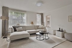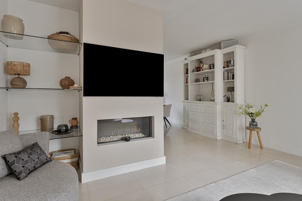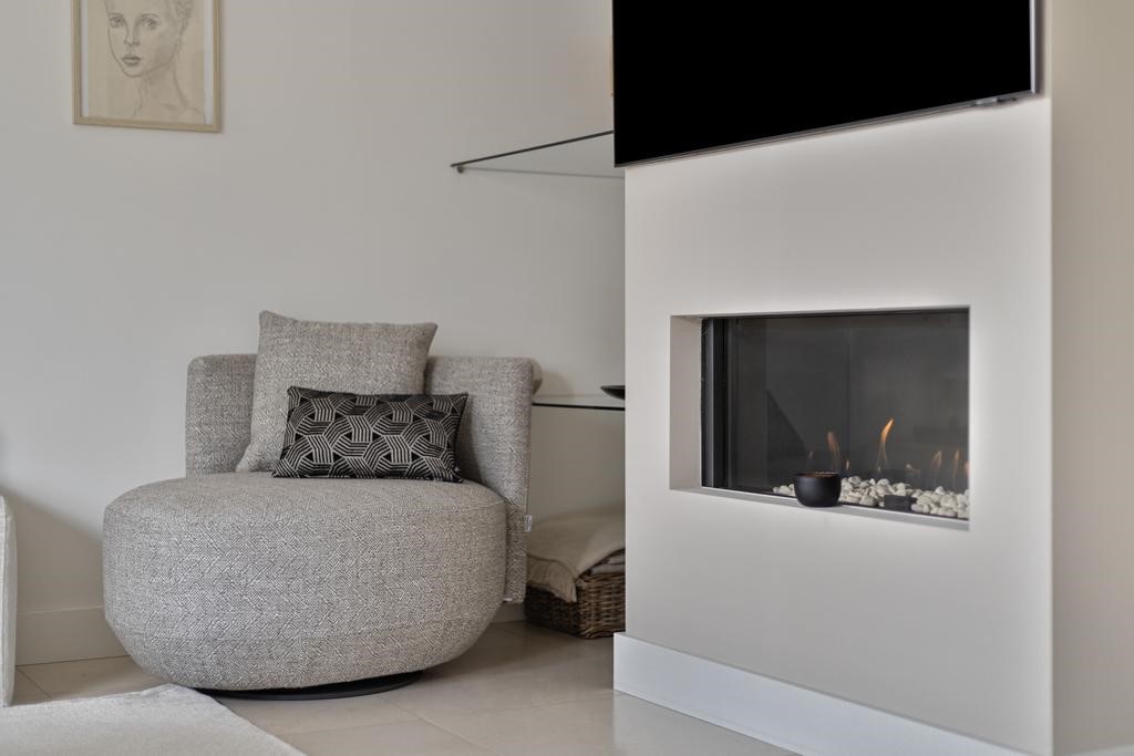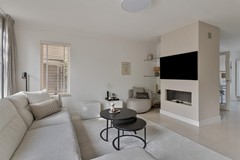 Woonkamer: Meteen bij binnenkomst word je verrast door de lichte ruime woonkamer. Deze living zou niet misstaan in een woonmagazine! Hier is meer dan voldoende ruimte voor een royale zithoek en een grote eettafel. De design gashaard in de hoek van de living geeft het zitgedeelte meteen een sfeervolle uitstraling. De grote schuifpui in de achtergevel zorgt voor een gezellig contact met de achtertuin, waar de natuurstenen vloer doorloopt op het terras.