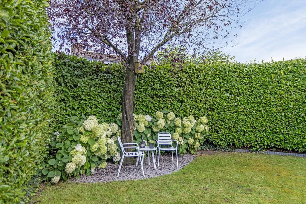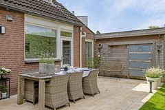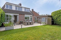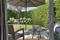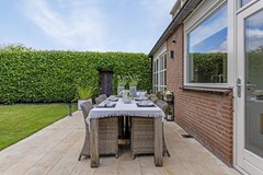 De royale vrij liggende achtertuin met groene afscheiding ligt op het westen en heeft dus de hele dag en tot laat in de avond de zon te pakken. De tuin beschikt over lekker veel privacy en maar liefst 2 terrassen. Een zeer groot terras aan de achterzijde van de woning en een tweede terras onder de boom. Hier zit je heerlijk in de schaduw. De tuin beschikt tevens over een ruime berging. Ideaal voor het opbergen van je tuinspullen en het parkeren van je fiets. Via de poort aan de zijkant kun je ook gemakkelijk met je fiets achterom.