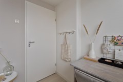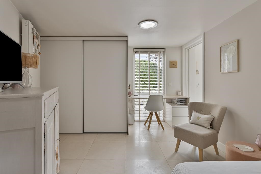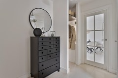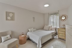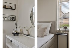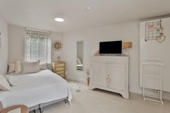 Slaapkamer: Via de keuken bereik je de royale slaapkamer op de begane grond. Deze beschikt over een ruime inbouwkast met daarin tevens de aansluitingen voor de wasmachine en de droger. Er is ook een thuiswerkplek gecreëerd.