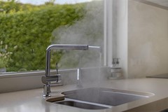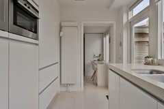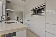 Keuken: De moderne, hoogglans, greeploze keuken bevindt zich aan de achterzijde van de woning en is van vele gemakken voorzien. Je hebt er de beschikking over een inductie kookplaat met een RVS afzuigkap, een dubbele spoelbak met Quooker, en een vaatwasser. Daar tegenover vind je in de kastenwand; de koelkast, de vriezer, een combi/oven en een koffiezetautomaat op ooghoogte. Alle apparatuur is van A merken. Terwijl je hier de lekkerste gerechten bereidt, heb je gezellig contact met je gasten aan de eettafel of in de tuin.