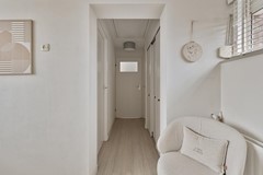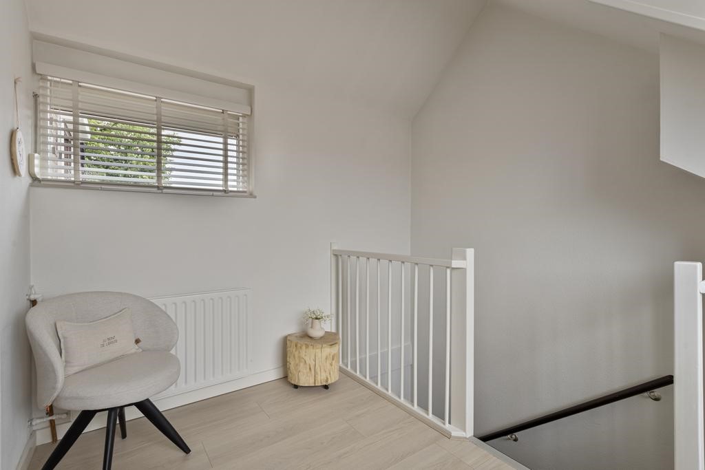 Via de mooi gerenoveerde vaste trap bereik je de meer dan ruime overloop op de eerste verdieping. De overloop biedt o.a. ruimte aan een thuiswerkplek en geeft toegang tot de gang naar de twee slaapkamers, een inbouwkast en de badkamer. De riante "master bedroom" vind je aan de voorzijde van de woning. Ook deze is weer zeer smaakvol ingericht en beschikt over een kastenwand over de gehele lengte van de kamer. Aan de achterzijde bevindt zich de tweede slaapkamer. De slaapkamers zijn voorzien van een nette afwerking en een "houtlook" laminaatvloer die mooi doorloopt naar de overloop. De gehele bovenverdieping is voorzien van rolluiken. De badkamer is volledig betegeld met strakke witte wandtegels en terracotta vloertegels. Hier kun je heerlijk relaxen in de ruime douche of in het heerlijke ligbad. Verder is er een brede wastafel en een hangtoilet.