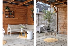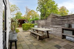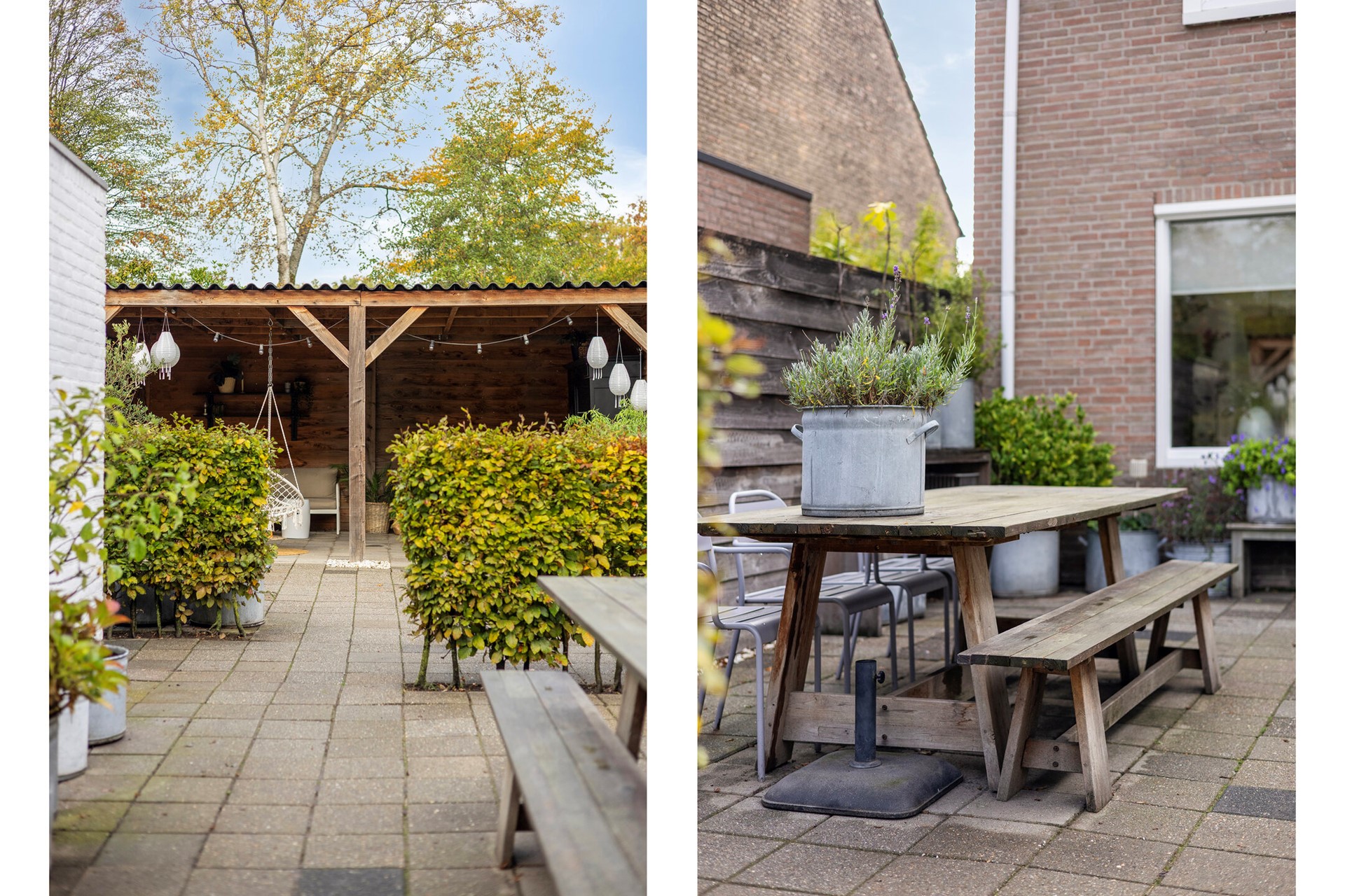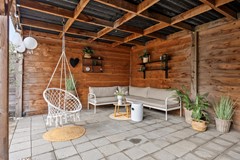 Het grote terras is perfect voor lange zomeravonden, terwijl de ruime overkapping ervoor zorgt dat je zelfs tijdens een zomerse bui comfortabel buiten kunt blijven zitten. De stenen berging biedt volop ruimte voor fietsen en tuingereedschap.