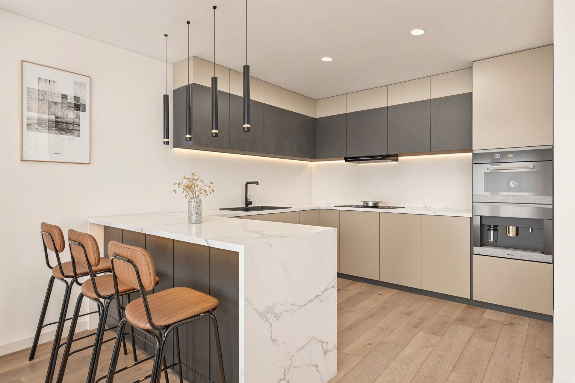 De open keuken vormt het hart van de living — een uitnodigende plek waar geuren, verhalen en gezelligheid samenkomen. Hier bak je verse croissantjes op zondagochtend, of kook je een uitgebreid diner voor vrienden. Ruimte genoeg om lekker uitgebreid te tafelen.