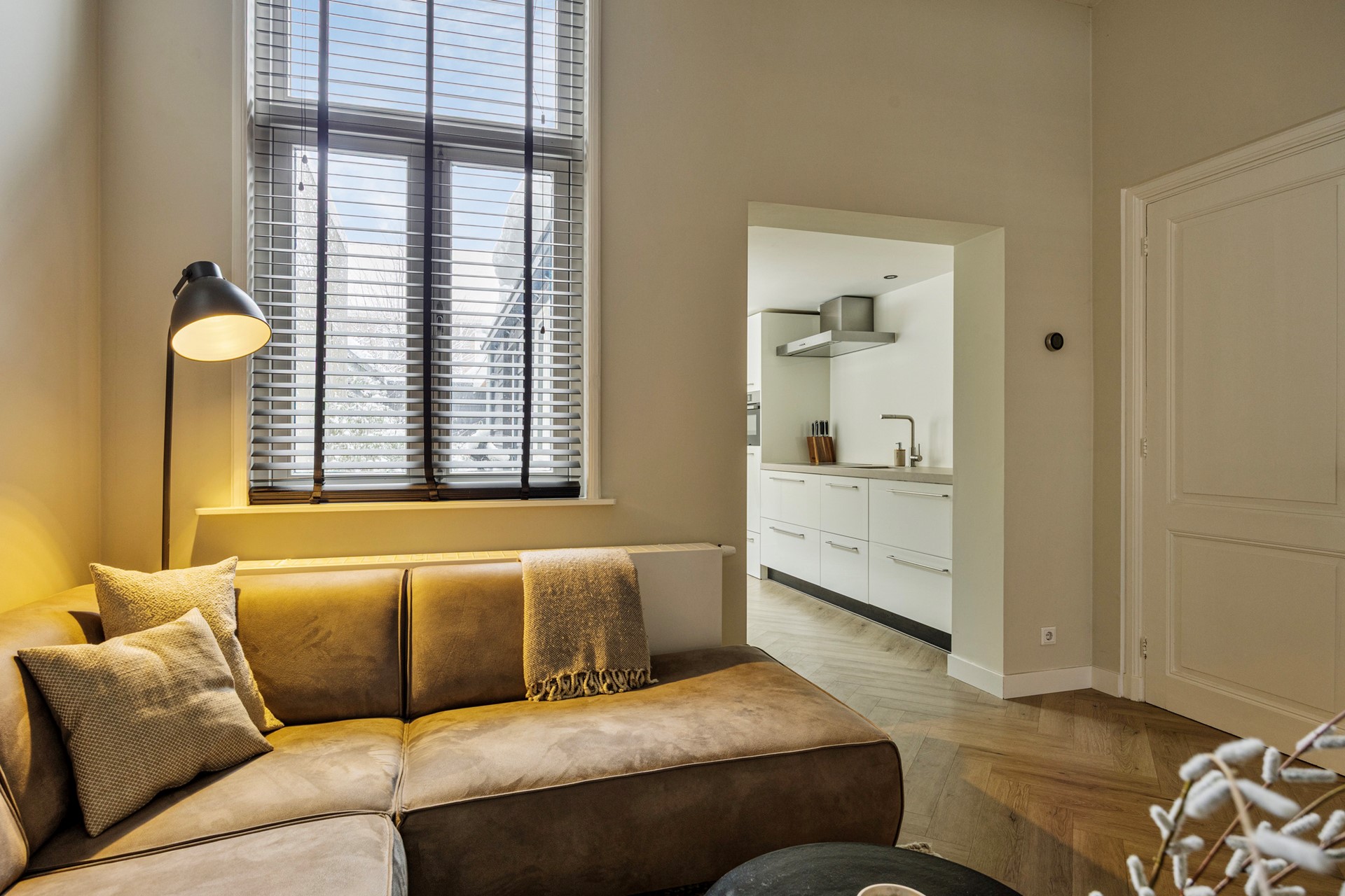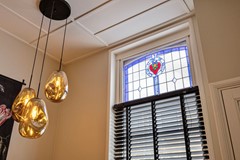 In de woonkamer geeft het hoge plafond een ruimtelijk gevoel en het glas-in-loodraam in de eetkamer versterkt de klassieke sfeer van de woning. Vanuit de eetkamer loopt de prachtige PVC-vloer met houtlook, gelegd in een elegante visgraat, naadloos door naar de woonkamer, de keuken en zelfs de hal achter de keuken.
