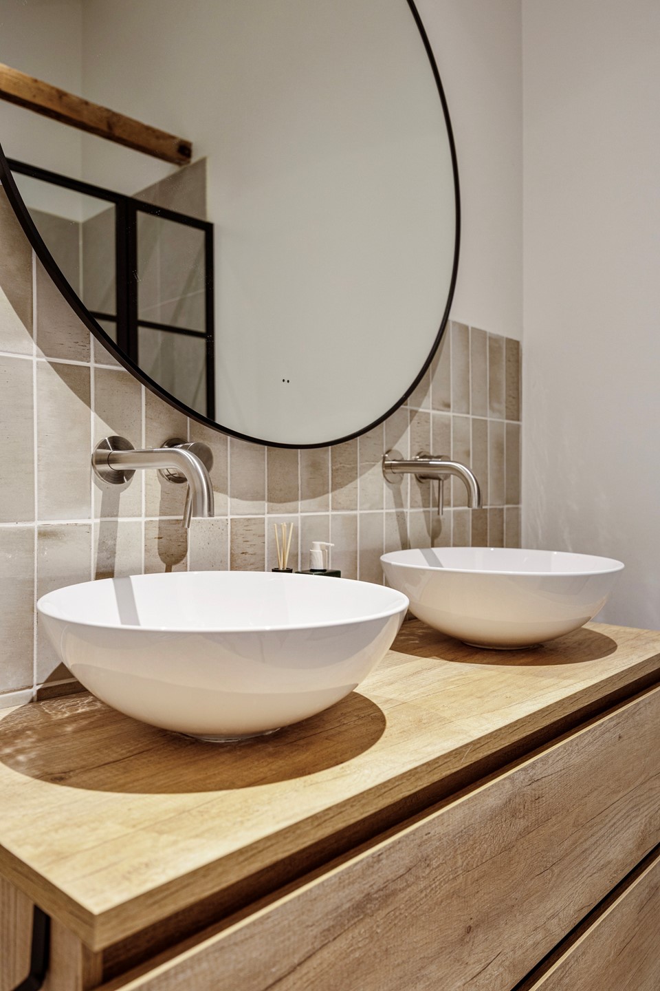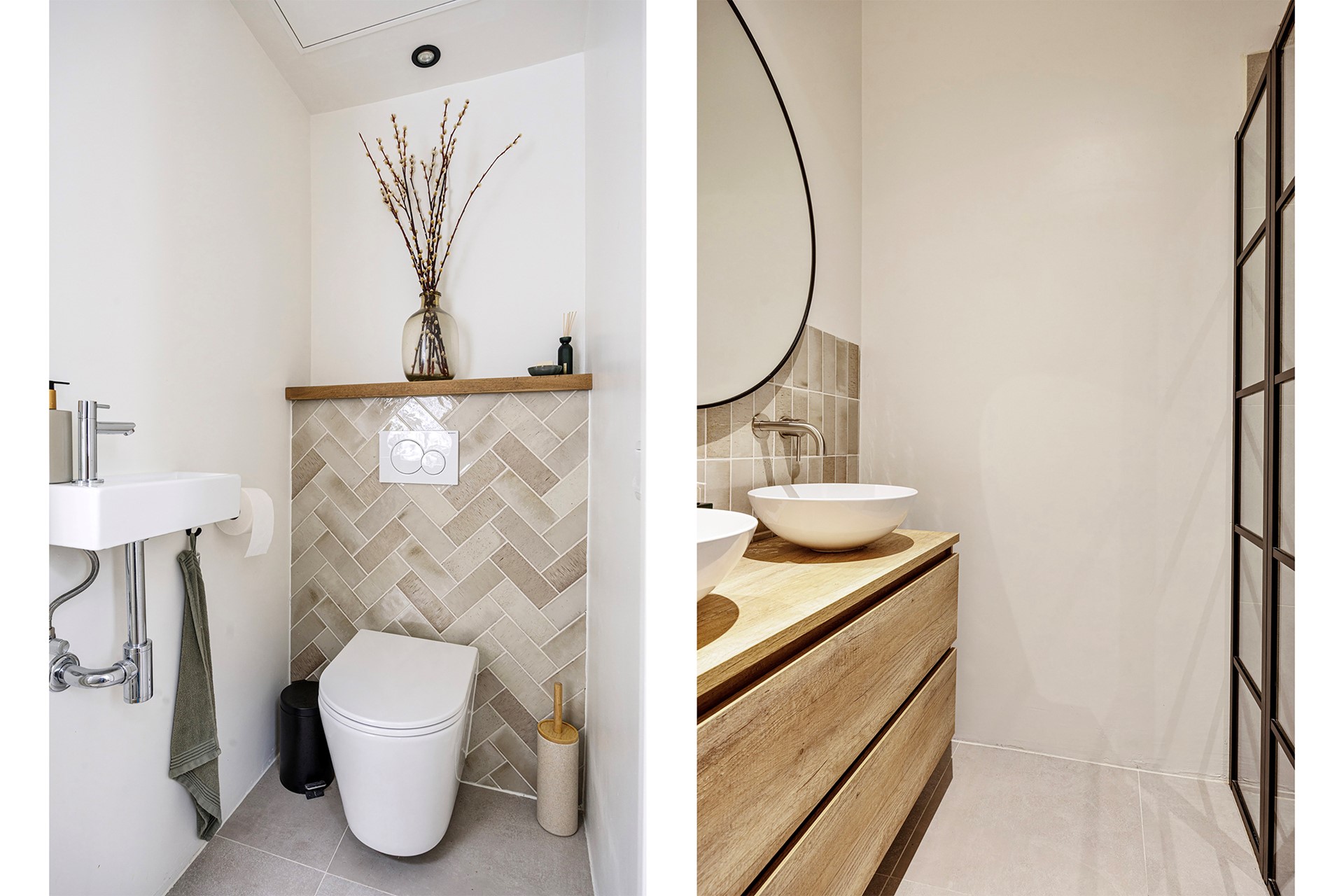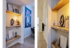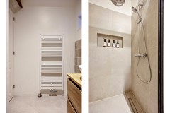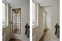 Via de sfeervolle schuifdeur met glas-in-loodraam bereik je de hal achter de keuken. Hier bevinden zich het toilet en de badkamer, beide volledig gerenoveerd in 2023. De badkamer is voorzien van een ruime inloopdouche, twee wastafelkommen op een wastafelmeubel met opberglades en een designradiator.