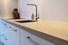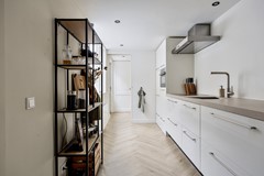 De keuken aan de achterzijde is in 2023 gerenoveerd en combineert modern comfort met een tijdloze uitstraling. De strakke witte keuken heeft een lichtgrijs, robuust aanrechtblad en is voorzien van een inductiekookplaat, RVS afzuigkap, combi-oven/combimagnetron, koelkast en vaatwasser.