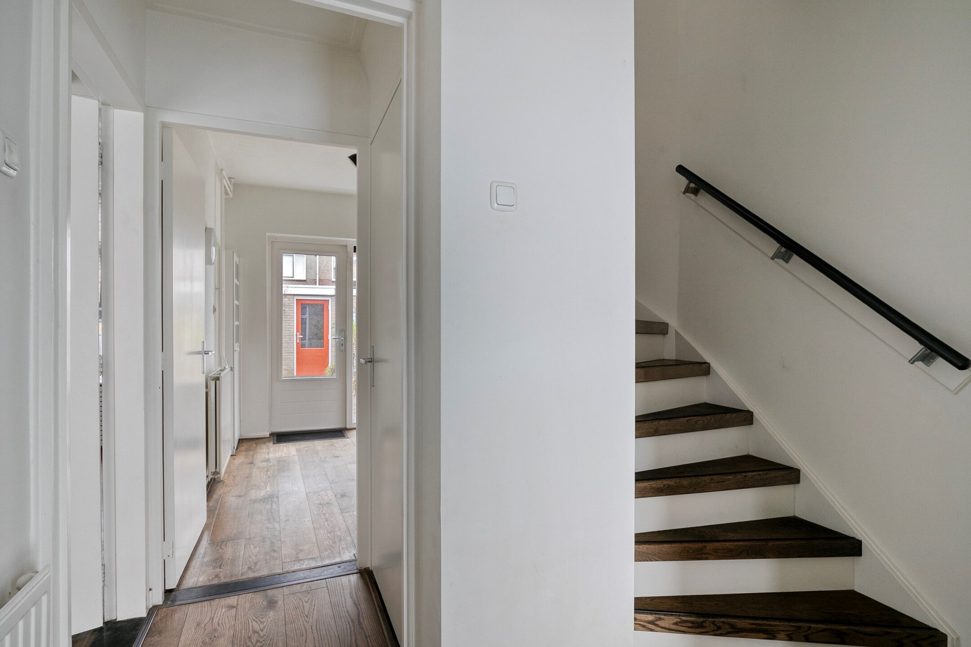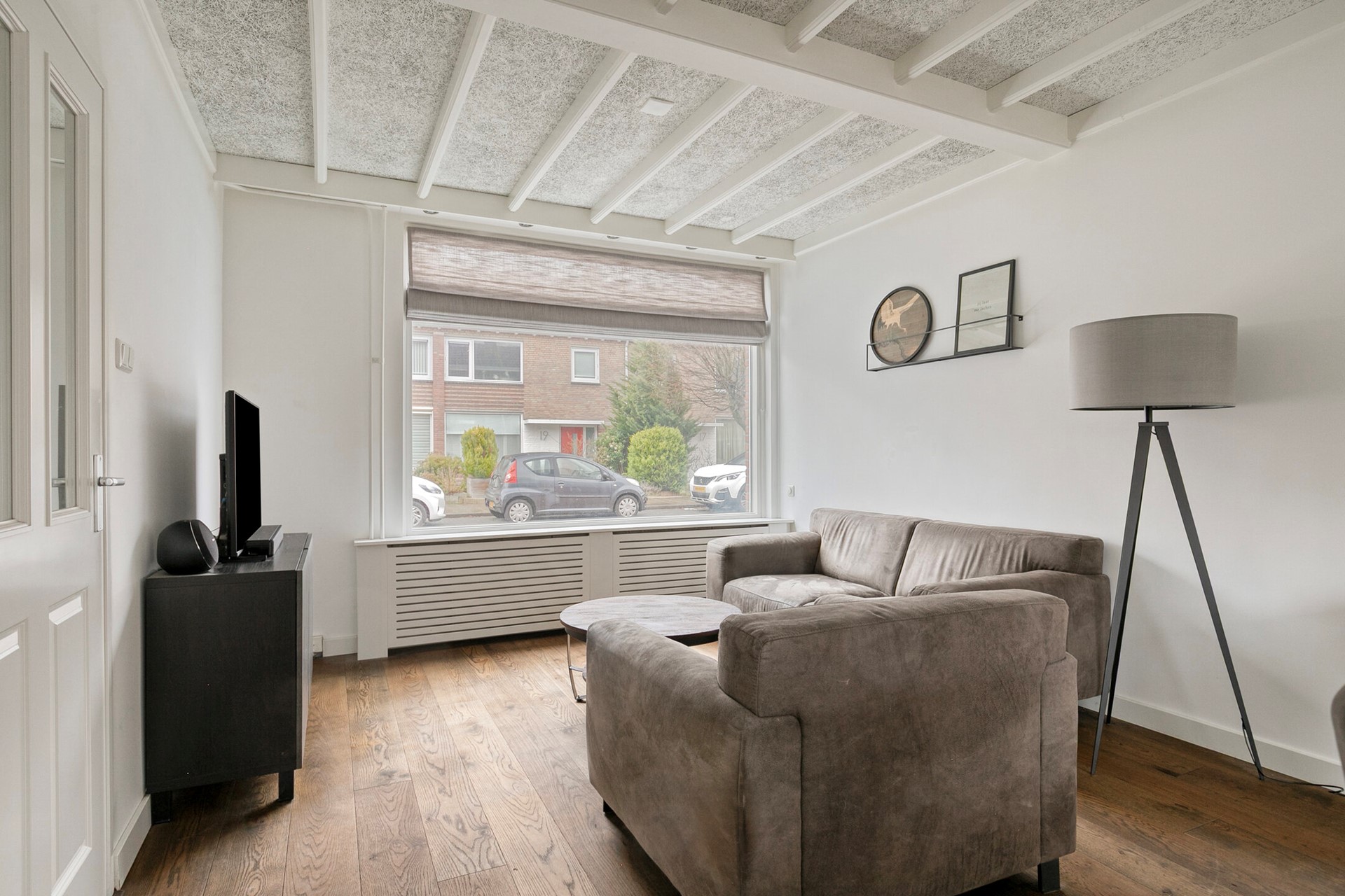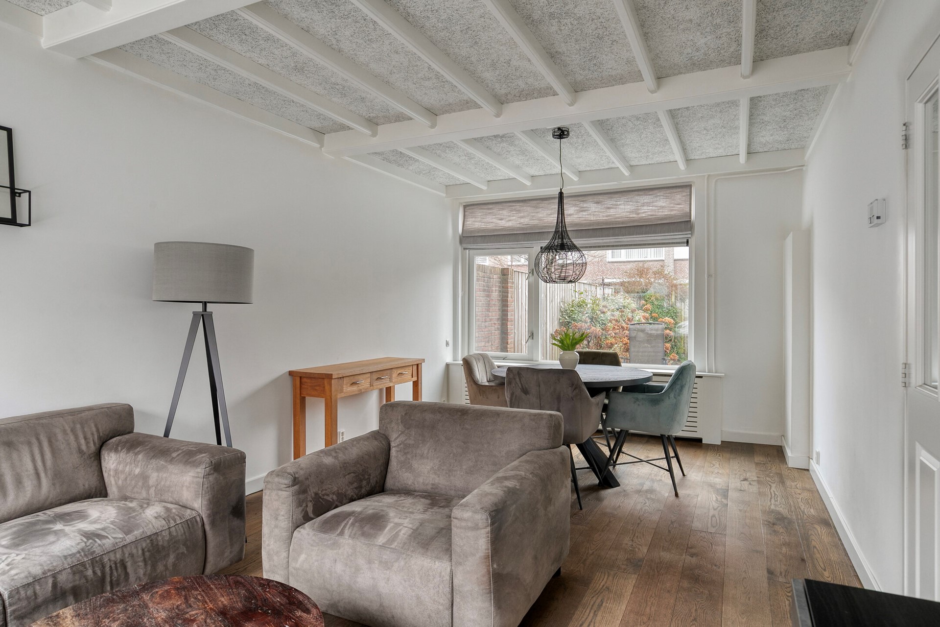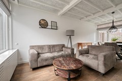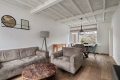 Binnen wordt u verwelkomd in een lichte woonkamer met grote raampartijen die het daglicht rijkelijk binnenlaten. De combinatie van strak gestuukte wanden, sierbalken aan het plafond en een fraaie eiken lamellenparketvloer zorgt voor een warme en huiselijke sfeer. Dit is de ruimte waar u samenkomt – voor lange avonden tafelen, ontspannen op de bank of gezellig borrelen met vrienden. De praktische trapkast biedt extra bergruimte en de indeling voelt logisch en comfortabel aan. Hier ervaart u het fijne gevoel van een woning die met zorg is bewoond en onderhouden.