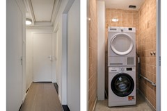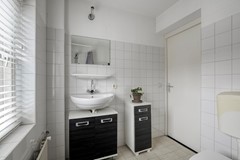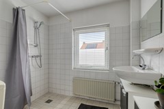 De badkamer is voorzien van een douche, vaste wastafel en closet en is afgewerkt met lichte wand- en vloertegels. De voormalige doucheruimte is momenteel ingericht als betegelde wasruimte met aansluiting voor de wasmachine – praktisch en efficiënt.