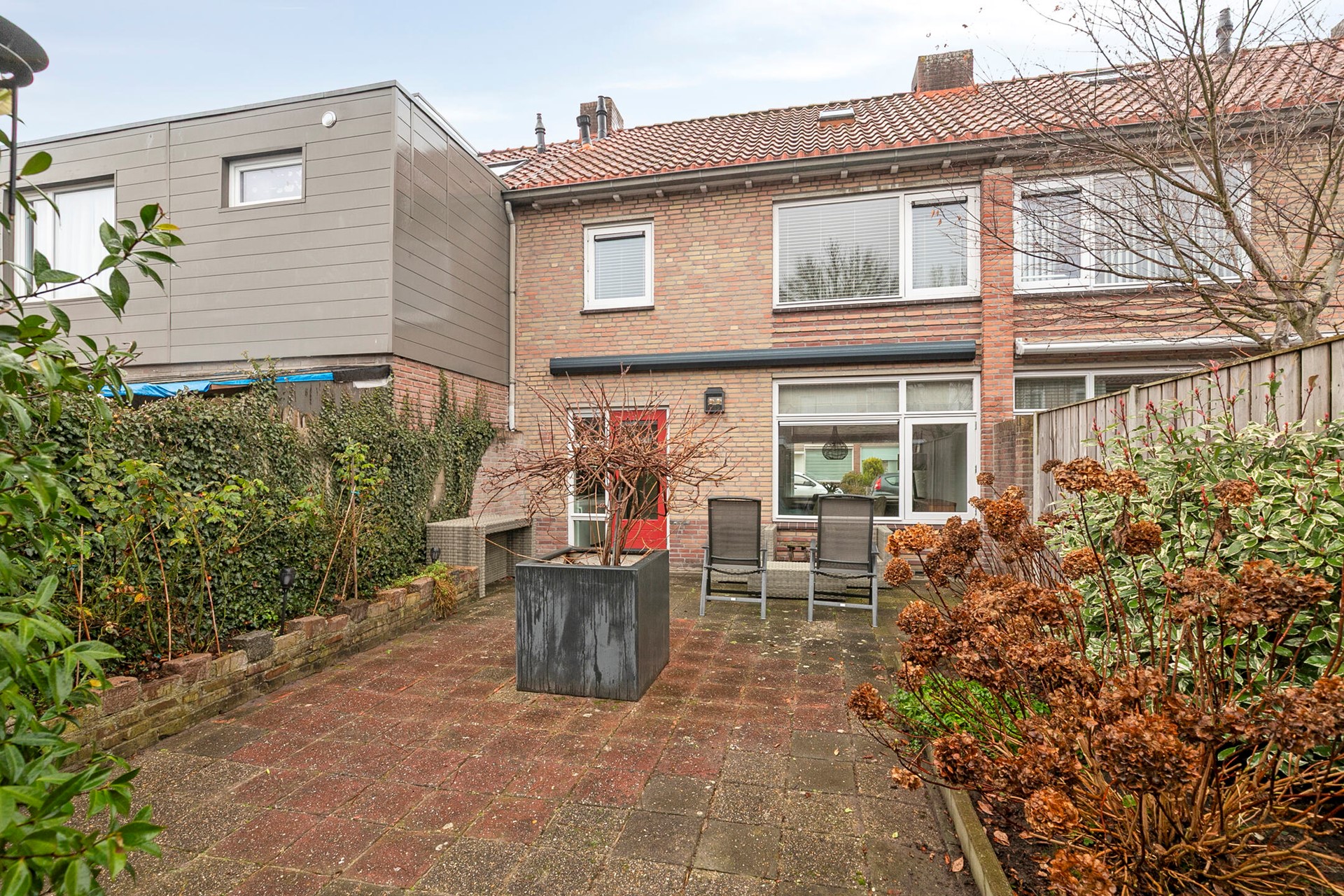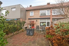 De tuin is verzorgd aangelegd met bestrating en groene borders, beschikt over een praktische berging met elektra én een achterom. Een fijne, onderhoudsvriendelijke buitenruimte met volop privacy.