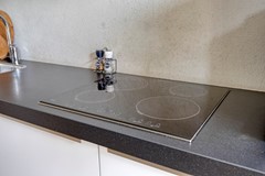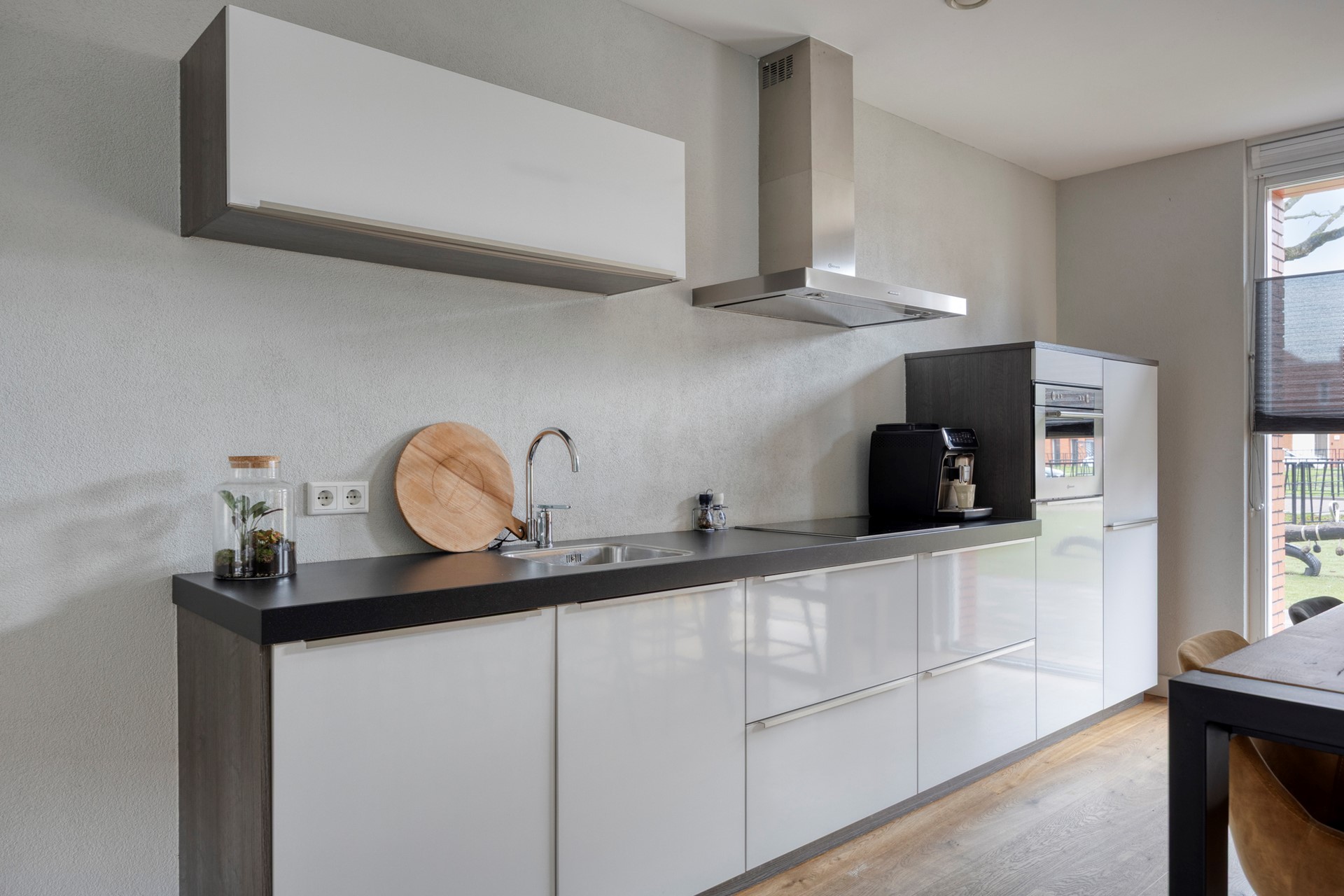 Aan de voorzijde van de woning bevindt zich de keuken, met een prachtig vrij uitzicht over het Sint Pieterpark. Een plek waar koken geen must is, maar een beleving. De lichte, moderne keuken is uitgevoerd met een dik aanrechtblad en hoogwaardige inbouwapparatuur, waaronder een RVS afzuigkap, kookplaat, combi-oven/combimagnetron op ooghoogte, koelkast, vriezer en vaatwasser. Hier begint de dag met koffie en eindigt hij met gezelligheid.