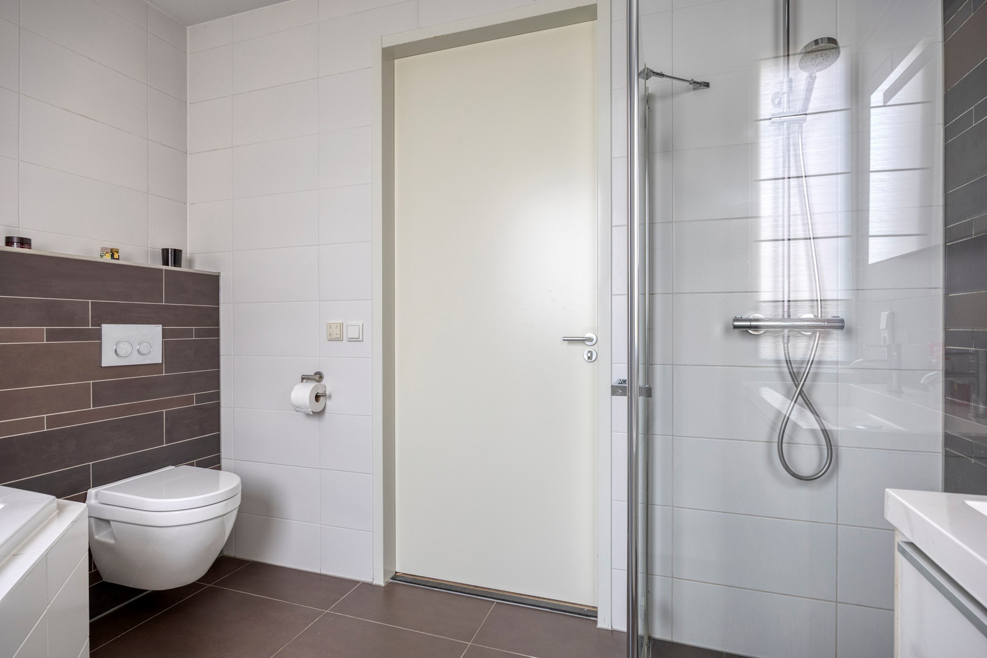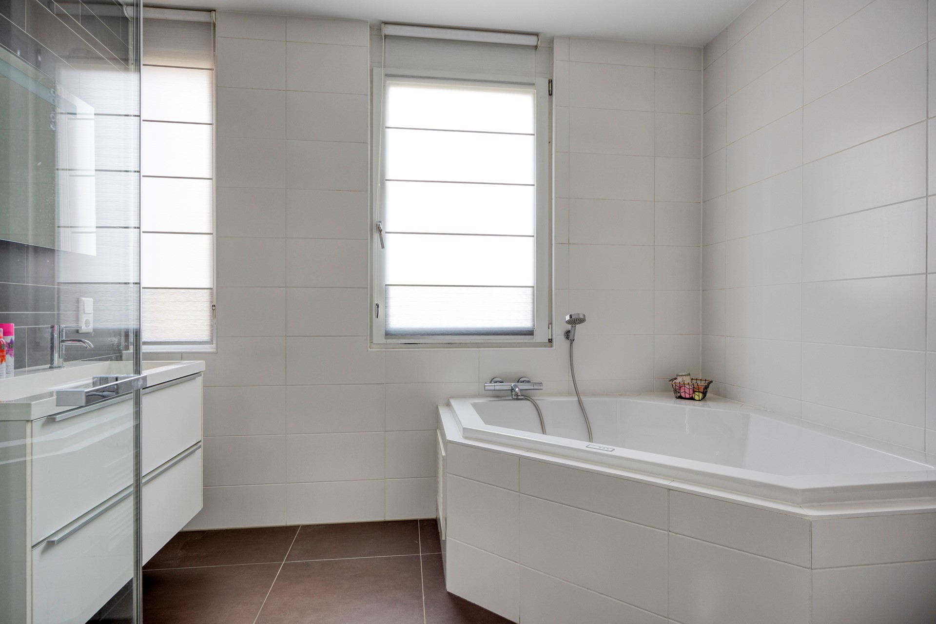 Op de eerste verdieping zorgen de houtlook laminaatvloer en vloerverwarming voor een rustige, hotelachtige uitstraling. Drie slaapkamers – twee aan de achterzijde en één aan de voorzijde – bieden ruimte voor het hele gezin, werken aan huis of logees. De moderne badkamer is een echte wellnessruimte, compleet met whirlpool, douche, dubbele wastafel met wandmeubel en toilet, volledig betegeld en tot in detail verzorgd.