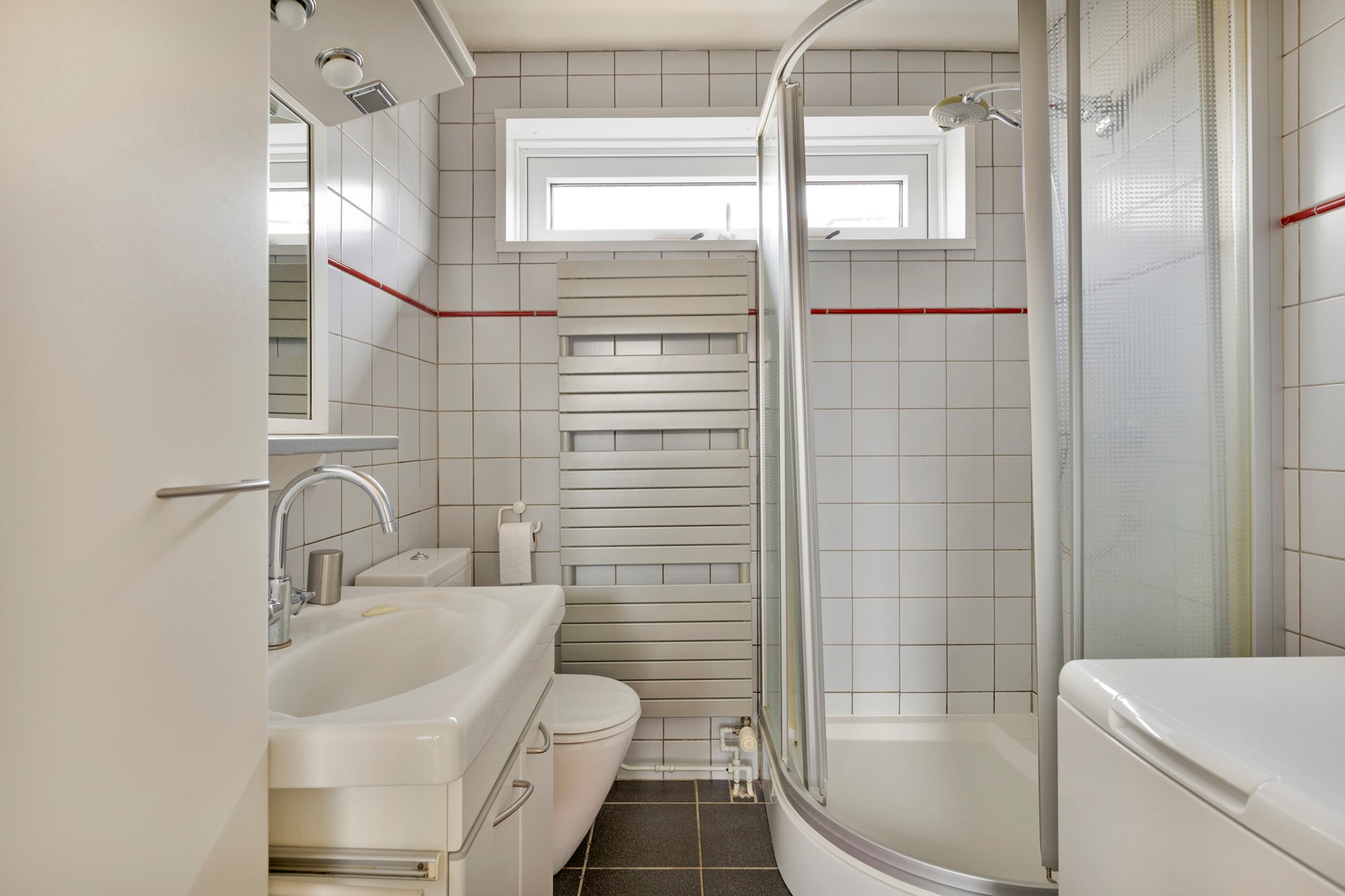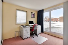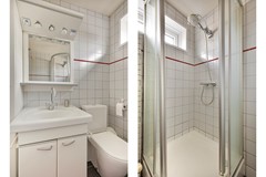 De master bedroom strekt zich uit over de volledige lengte van de verdieping – van voor naar achter – en voelt als een privésuite. Met een vaste kastenwand en directe toegang tot het dakterras is dit een plek om je terug te trekken en tot rust te komen. Ook de slaapkamer aan de achterzijde beschikt over een vaste kast én toegang tot het dakterras. De derde slaapkamer aan de voorzijde is perfect als kinder-, werk- of logeerkamer. De badkamer is stijlvol uitgevoerd met witte wandtegels en donkere vloertegels, voorzien van een wastafel met ondermeubel, toilet, ruime douche en aansluitingen voor de wasmachine. Praktisch én verzorgd.