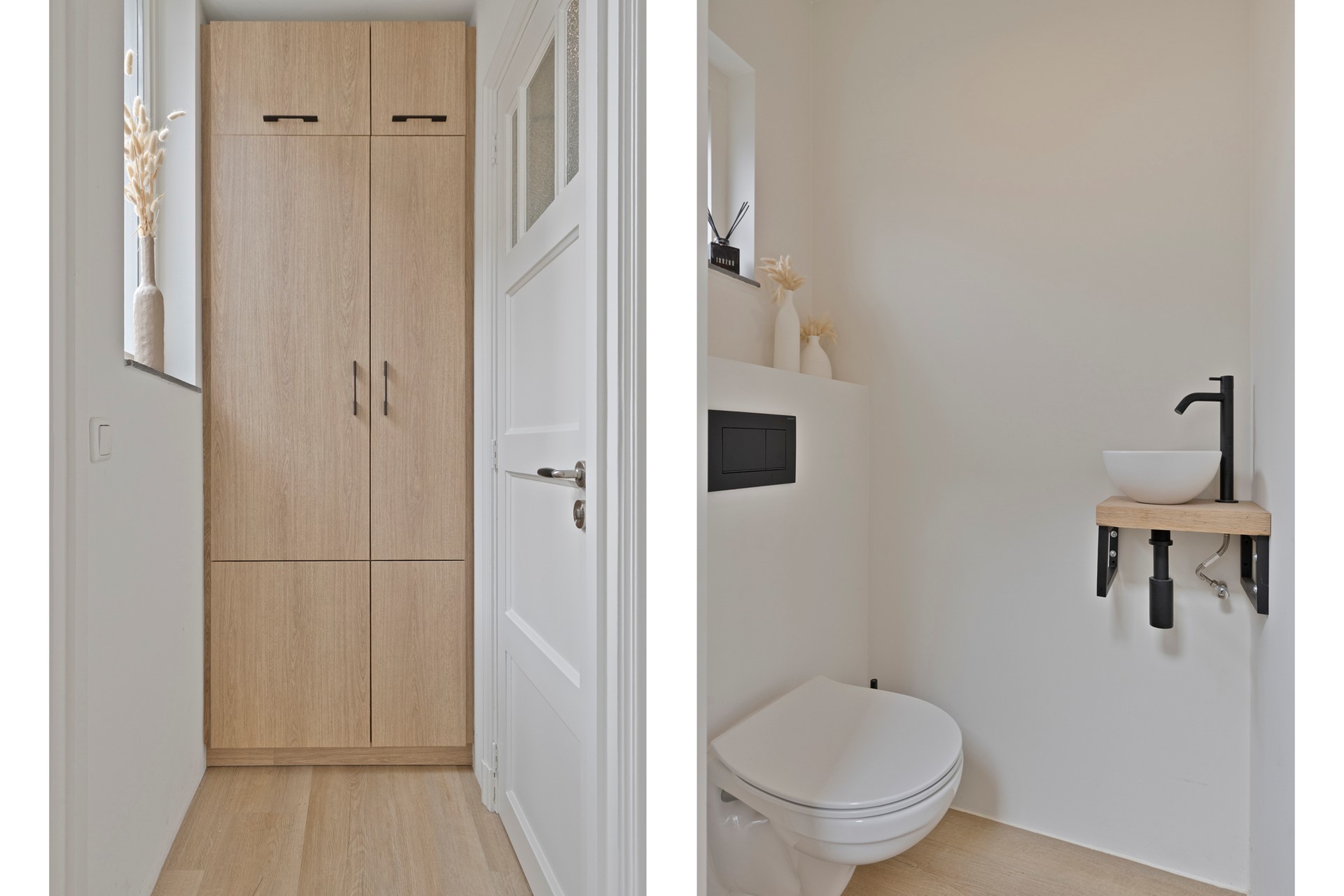 Achter de keuken bevindt zich een praktisch halletje met een stijlvolle kastenwand en een modern, zwevend toilet met fonteintje.