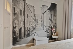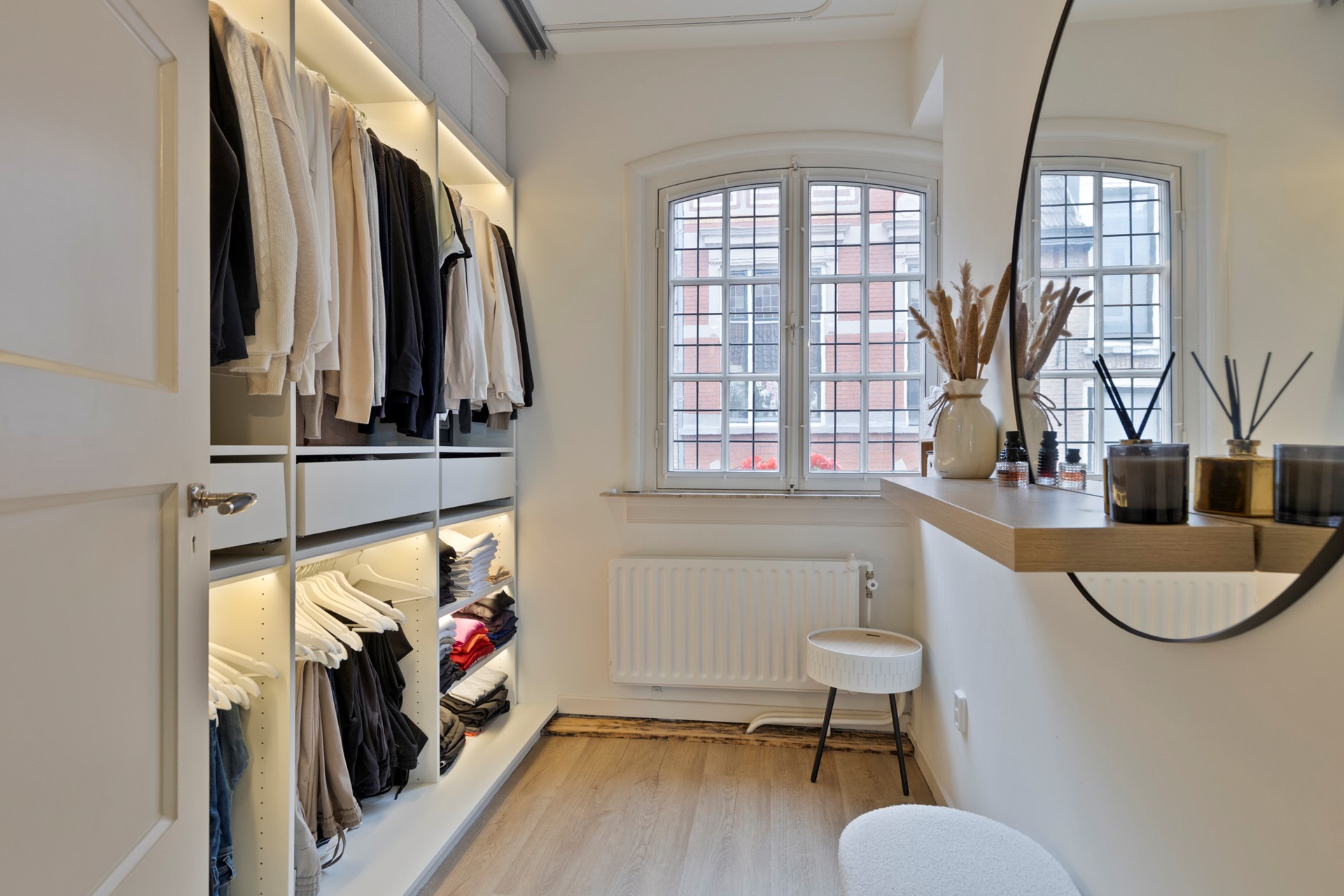 De overloop geeft toegang tot vier kamers, elk met hun eigen charme en mogelijkheden. Een van de kamers is nu ingericht als walk-in closet – een droom voor de liefhebber van mode en overzicht. Een van de kamers biedt toegang tot het dakterras – een privéplek waar de stad tot rust komt.