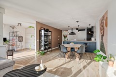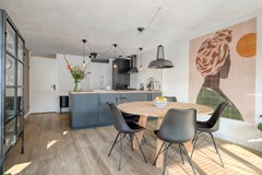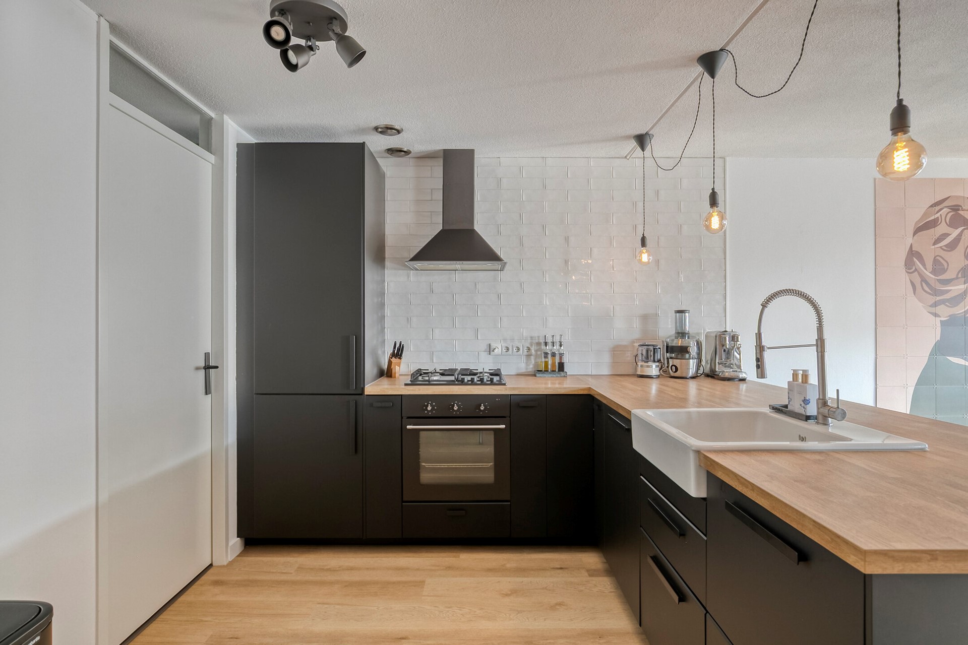 De strakke, matzwarte leefkeuken is een echte eyecatcher en nodigt uit tot koken, borrelen en gezellig tafelen. Het royale werkblad, de overvloed aan opbergruimte en de complete uitrusting maken koken een feestje. De keuken is voorzien van een koelkast, aparte vriezer, oven, vaatwasser, 4-pits gaskookplaat en een elegante RVS-afzuigkap.