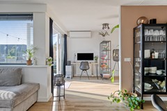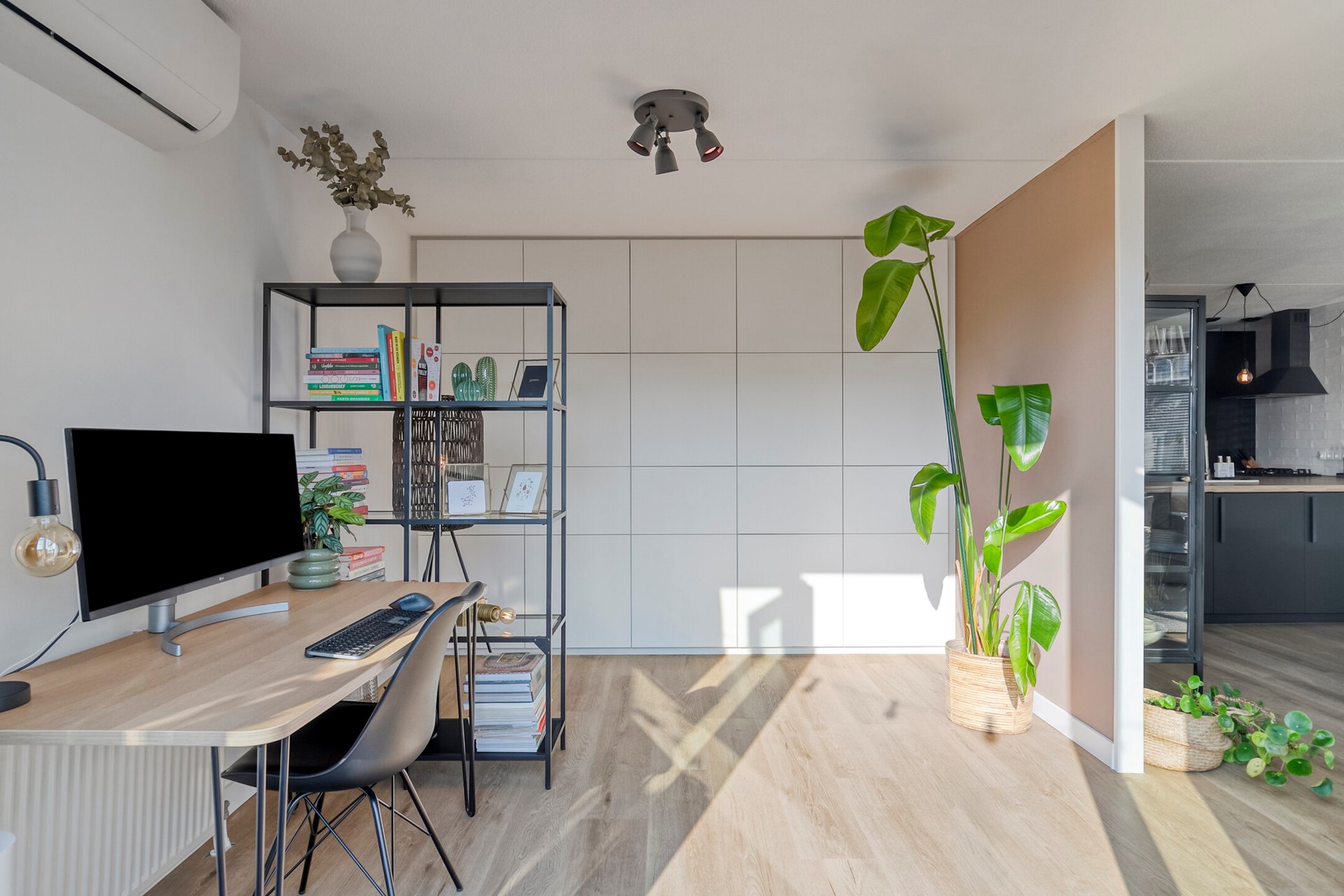 Het gedeelte van de woonkamer bij het balkon is nu ingericht als thuiswerkplek: licht, rustig en met veel opbergruimte. Wil je een extra kamer? Met een eenvoudige ingreep, zoals een wand met deur, creëer je hier gemakkelijk een tweede slaapkamer of afgesloten werkkamer.
