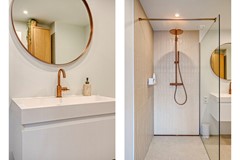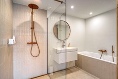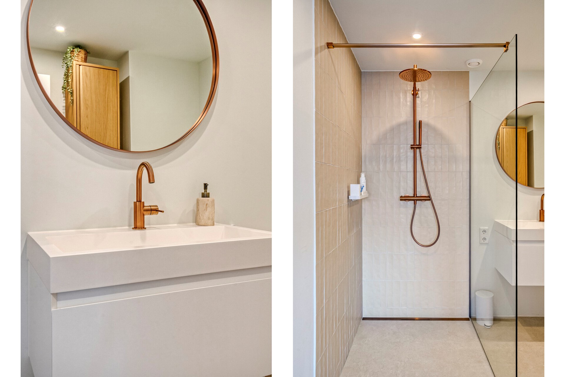 Grenzend aan de slaapkamer ligt een stijlvolle, splinternieuwe badkamer (juli 2024). Lekker ruim, voorzien van vloerverwarming (bedienbaar via een app) en strak afgewerkt met hoogwaardige materialen. Je vindt er een matwit ligbad, een royale inloopdouche met regendouche, een designradiator en een strak matwit wastafelmeubel. De koperen kranen geven een luxe, warme touch. Hier voelt elke douche of bad als een moment in je eigen privéspa.