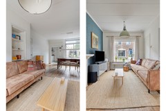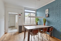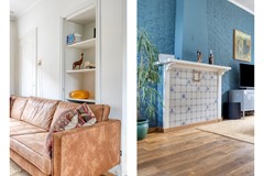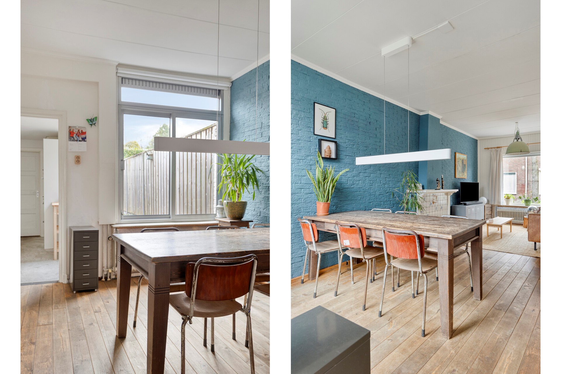 Zodra je de woonkamer binnenstapt, voel je het direct: dit is een ruimte met ziel. De prachtige eikenvloer zorgt voor een warme basis, terwijl de combinatie van wanden en het verhoogde plafond een speels en karaktervol geheel creëert. De doorzonindeling laat het daglicht rijkelijk binnenstromen, waardoor de ruimte op elk moment van de dag een fijne, lichte sfeer heeft. De authentieke schouw met tegels vormt een sfeervol middelpunt, perfect voor lange avonden thuis. Aan de voorzijde zorgt de inbouwkast voor praktische opbergruimte, terwijl de travertin vensterbanken een stijlvolle finishing touch geven.
