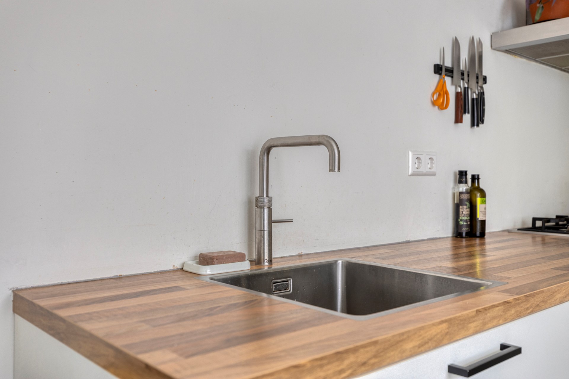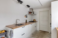 Aansluitend aan de keuken bevindt zich de bijkeuken: een ruimte die in het dagelijks leven al snel onmisbaar wordt. Praktisch ingericht en deels betegeld, met aansluitingen voor wasapparatuur en de opstelling van de HR-combiketel, is dit dé plek waar functionaliteit samenkomt met gemak. Of het nu gaat om wassen, opbergen of het creëren van extra werkruimte – hier is overal aan gedacht. Bovendien vormt de bijkeuken een slimme verbinding tussen binnen en buiten, met directe toegang tot de tuin én de badkamer.