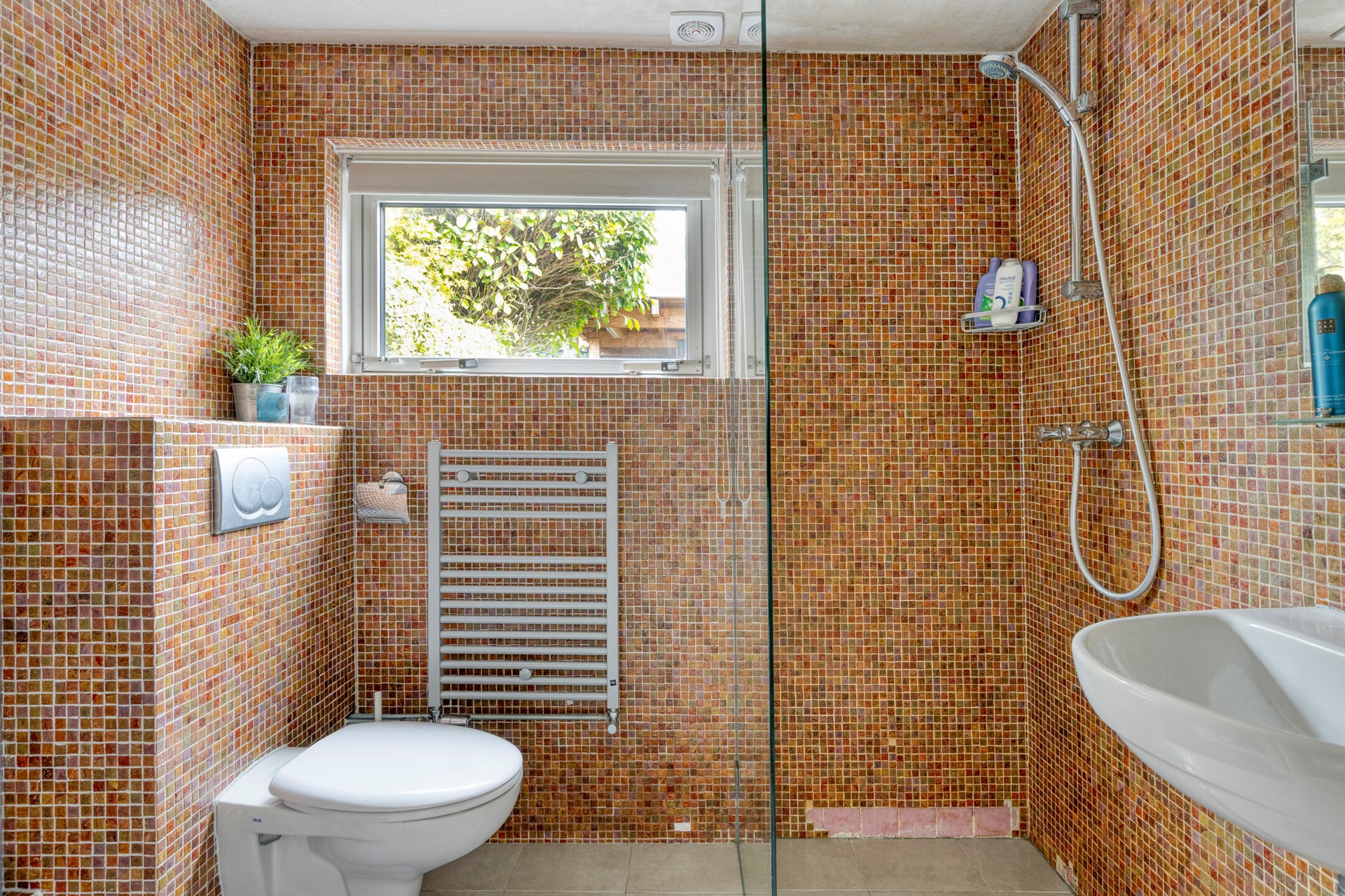 De badkamer is verzorgd en eigentijds afgewerkt. De speelse mozaïekbetegeling geeft de ruimte een moderne uitstraling, terwijl de inloopdouche met glazen wand zorgt voor een luxe gevoel. Met een zwevend toilet, wastafel en designradiator is dit een complete en comfortabele ruimte waar je heerlijk tot rust komt.