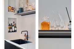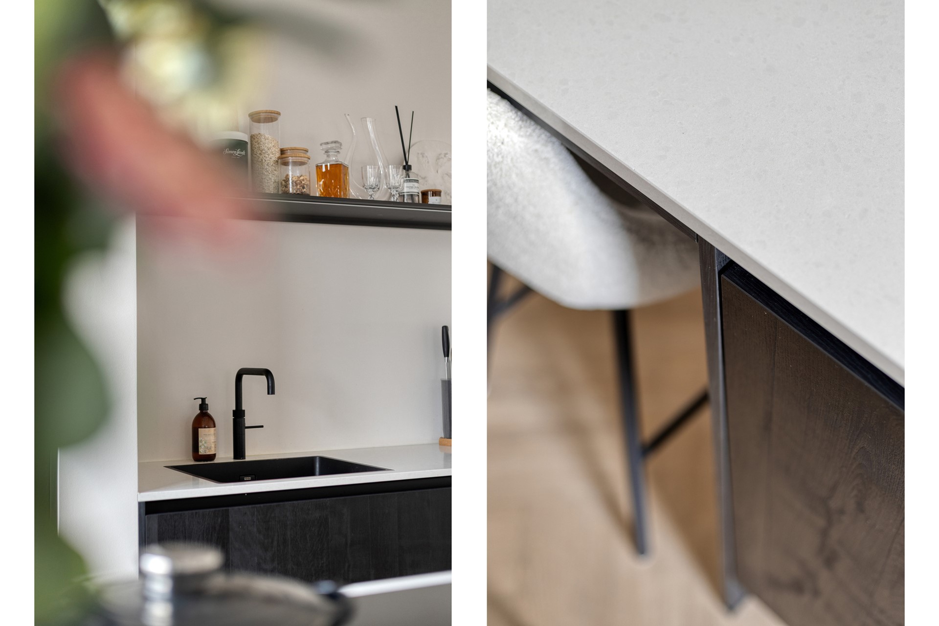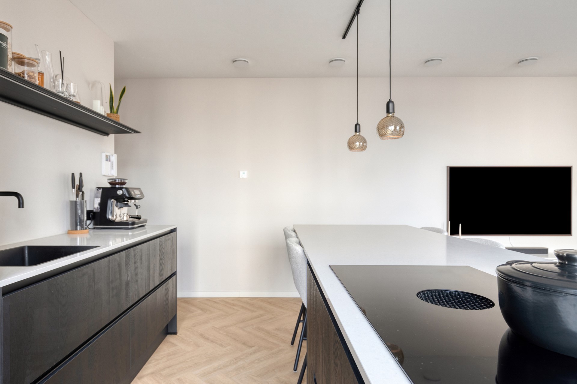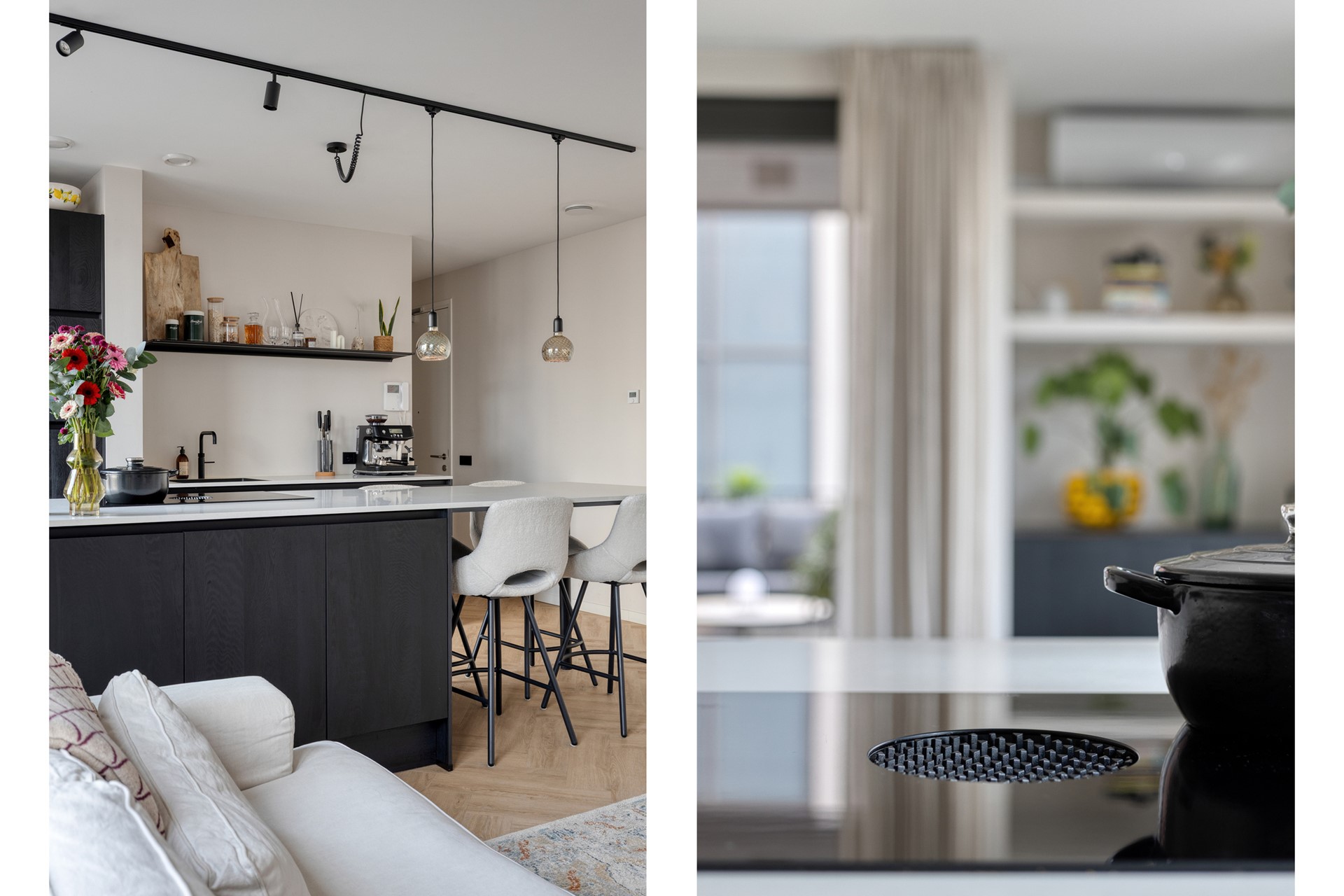 Centraal in de woning bevindt zich de open keuken: een echte blikvanger. Uitgevoerd in zwart gelakt eiken met een composiet werkblad, voorzien van een royaal kookeiland en een op maat gemaakte kastenwand in dezelfde stijlvolle uitvoering. De keuken verbindt koken, wonen en tafelen op een natuurlijke manier. Hoogwaardige apparatuur zoals een Bora inductiekookplaat met geïntegreerde afzuiging, Quooker, combi-oven, vaatwasser en koel-vriescombinatie maken het geheel compleet. Dit is een plek waar geleefd, gekookt en genoten wordt.