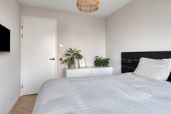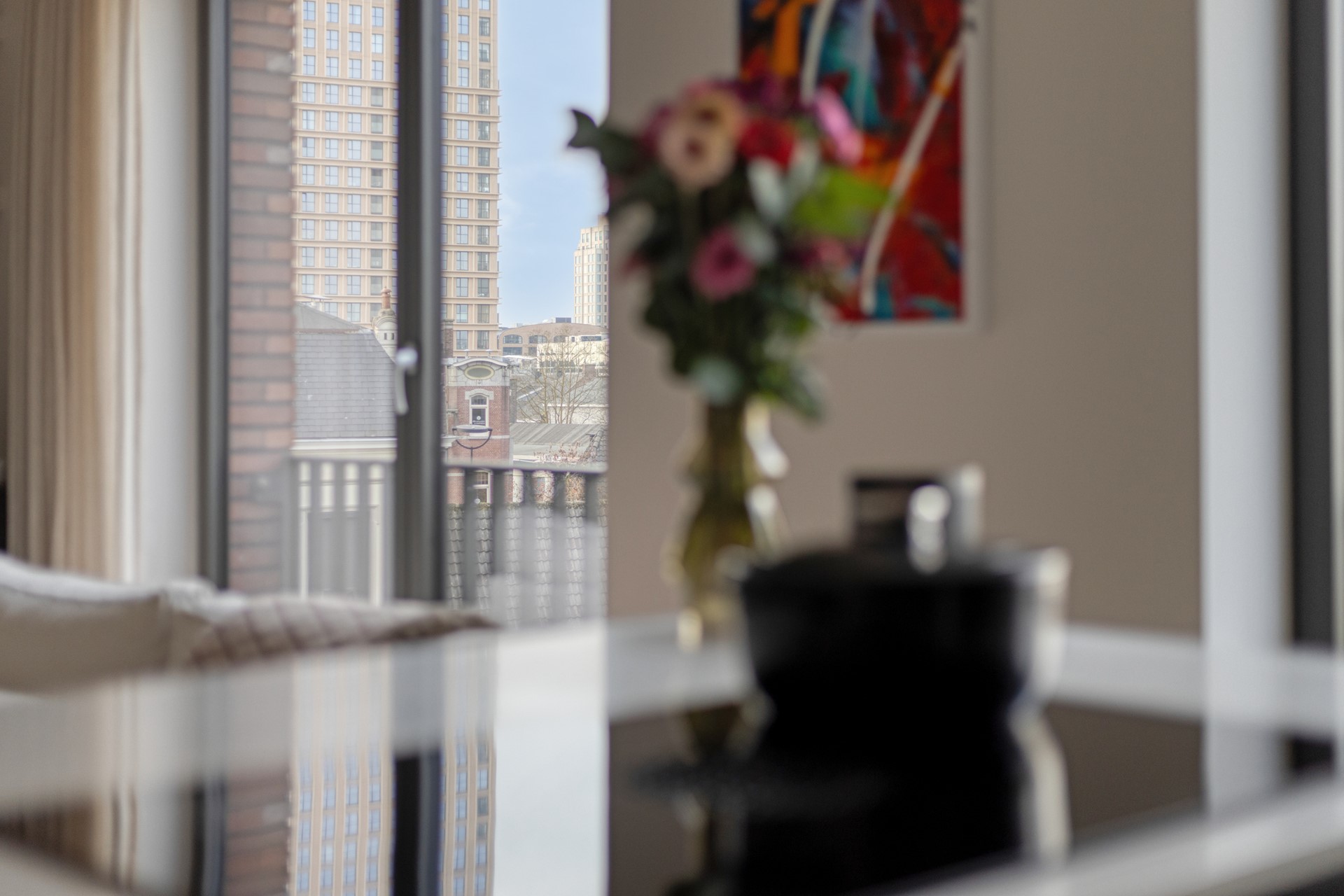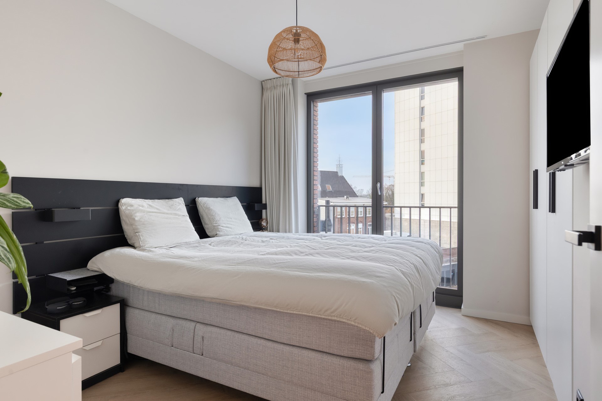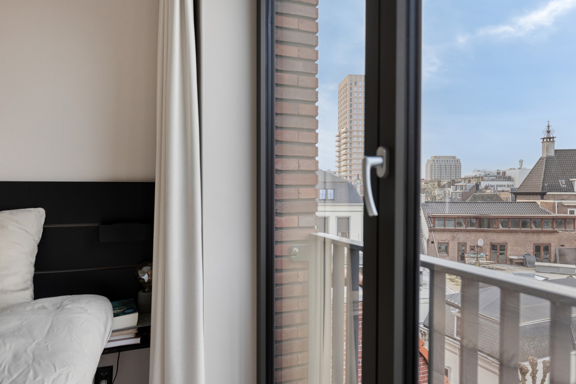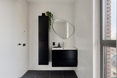De ruime slaapkamer is een oase van rust en beschikt over een charmant Frans balkon met openslaande deuren en kiepstand. Een fijne plek om de dag te beginnen met frisse lucht of juist af te sluiten met de stad op de achtergrond. De moderne badkamer is volledig betegeld en luxe uitgevoerd met een inloopdouche met regendouche, wastafelmeubel en designradiator — strak, comfortabel en tijdloos.