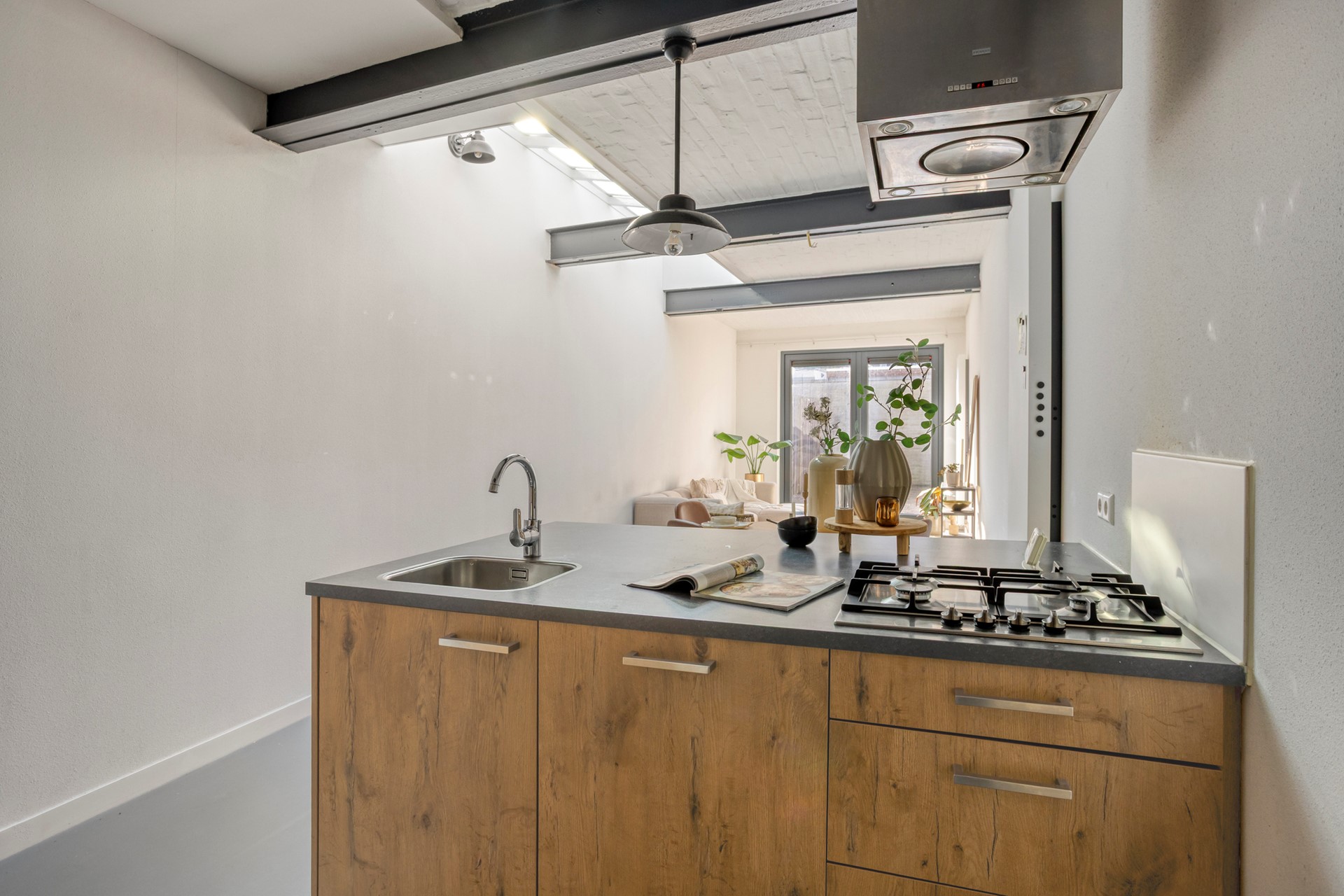 Loop je verder naar achteren, dan kom je in de keuken — een plek waar design en functionaliteit perfect samenkomen. Er is gekozen voor een strak, tijdloos ontwerp dat moeiteloos past bij de industriële sfeer van de woning. Uiteraard ontbreekt het hier aan niets: een vaatwasser, koelkast, combi-magnetron, 4-pits gaskookplaat met RVS afzuigkap en een RVS spoelbak maken deze keuken compleet. Hier bereid je moeiteloos een snelle doordeweekse maaltijd of een uitgebreid diner met vrienden. Onder de trap bevindt zich nog een praktische trapkast, ideaal voor het opbergen van voorraad of huishoudelijke spullen.