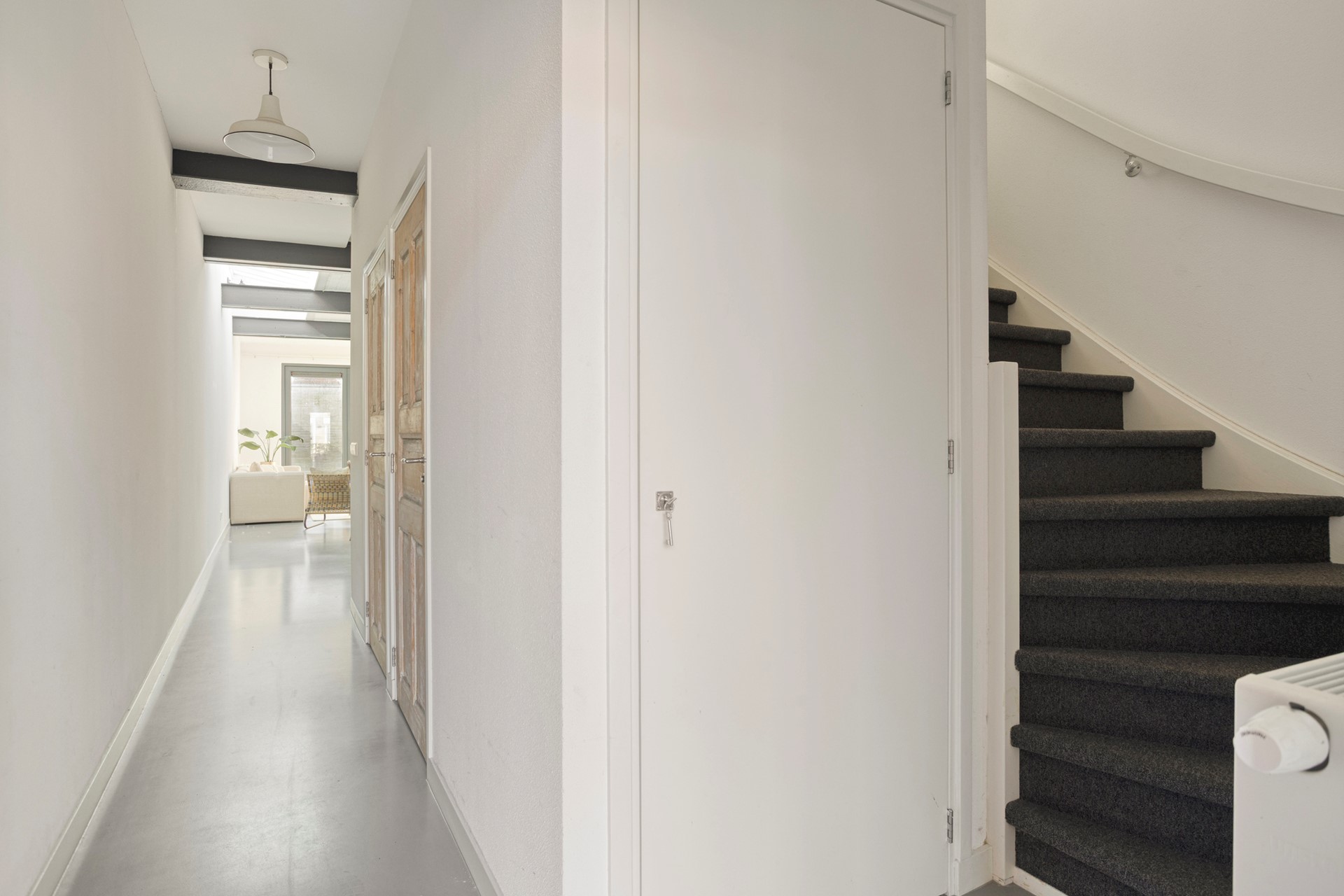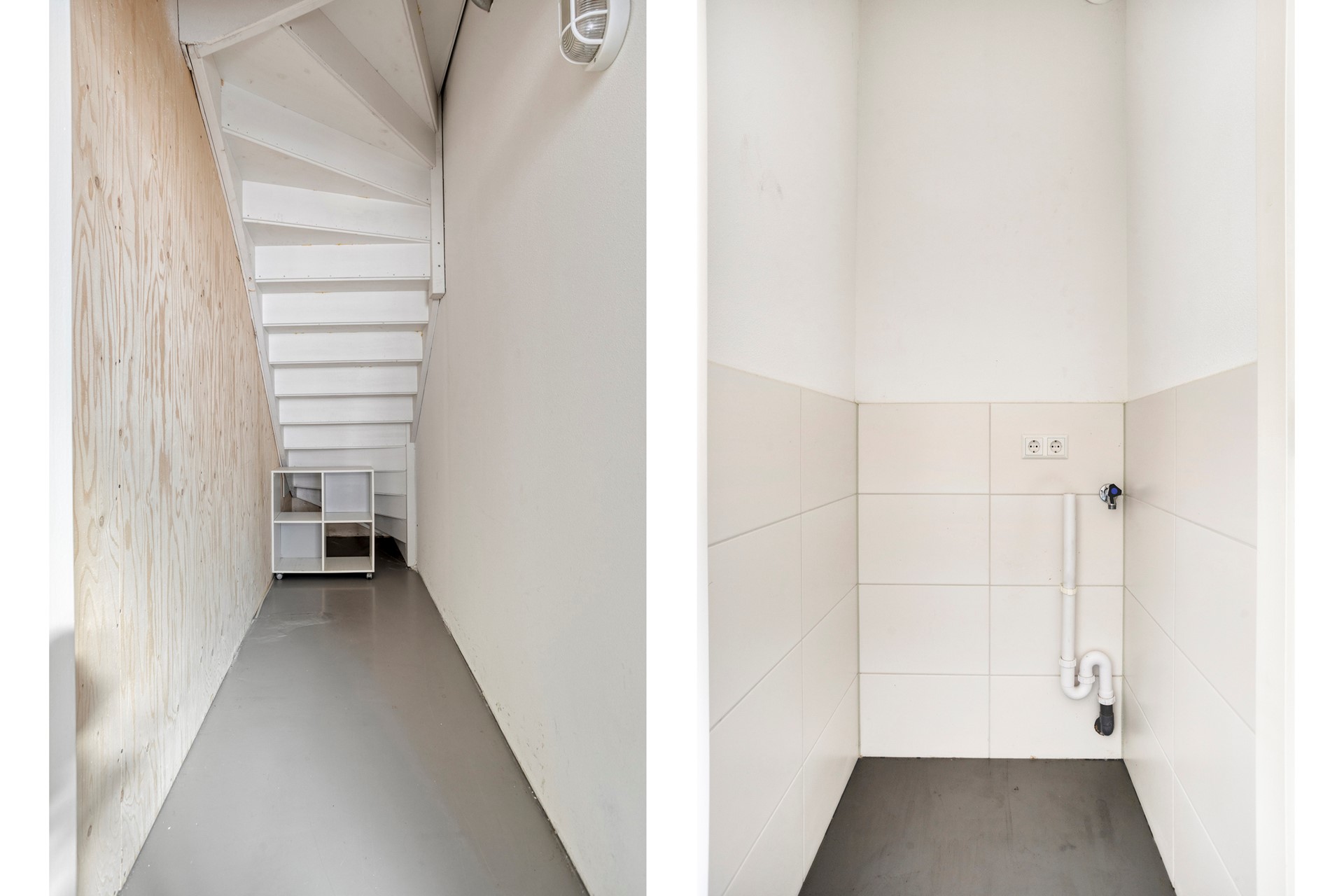Je betreedt de woning via de royale entree. In de hal bevinden zich de meterkast, het toilet en een praktische berging met aansluitingen voor wasmachine en droger. Alles is hier strak afgewerkt en direct klaar voor gebruik.