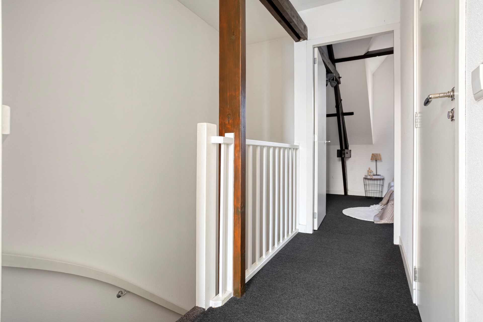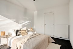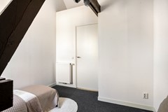 Via de vaste trap bereik je de eerste verdieping, welke volledig nieuw is opgebouwd. Deze opbouw is aan de achterzijde uitgevoerd met zink en daardoor onderhoudsarm. Hier bevinden zich twee slaapkamers en de badkamer. De slaapkamers zijn netjes afgewerkt met vloerbedekking en strak gestucte wanden, waardoor ze een rustige en verzorgde uitstraling hebben. Ideaal als comfortabele slaapkamer, werkruimte of logeerkamer. De badkamer voelt als een kleine wellnessruimte. Dankzij de combinatie van grote witte en grijze tegels heeft de ruimte een luxe en serene uitstraling. Je vindt hier een wastafel met ondermeubel en een royale douche — een fijne plek om de dag ontspannen te beginnen of af te sluiten.