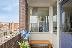 Vanuit de woonkamer stap je het balkon op, gelegen op het westen. Hier geniet je volop van de middag- en avondzon. Na een lange dag is dit de perfecte plek om met een drankje te ontspannen terwijl de zon langzaam ondergaat.