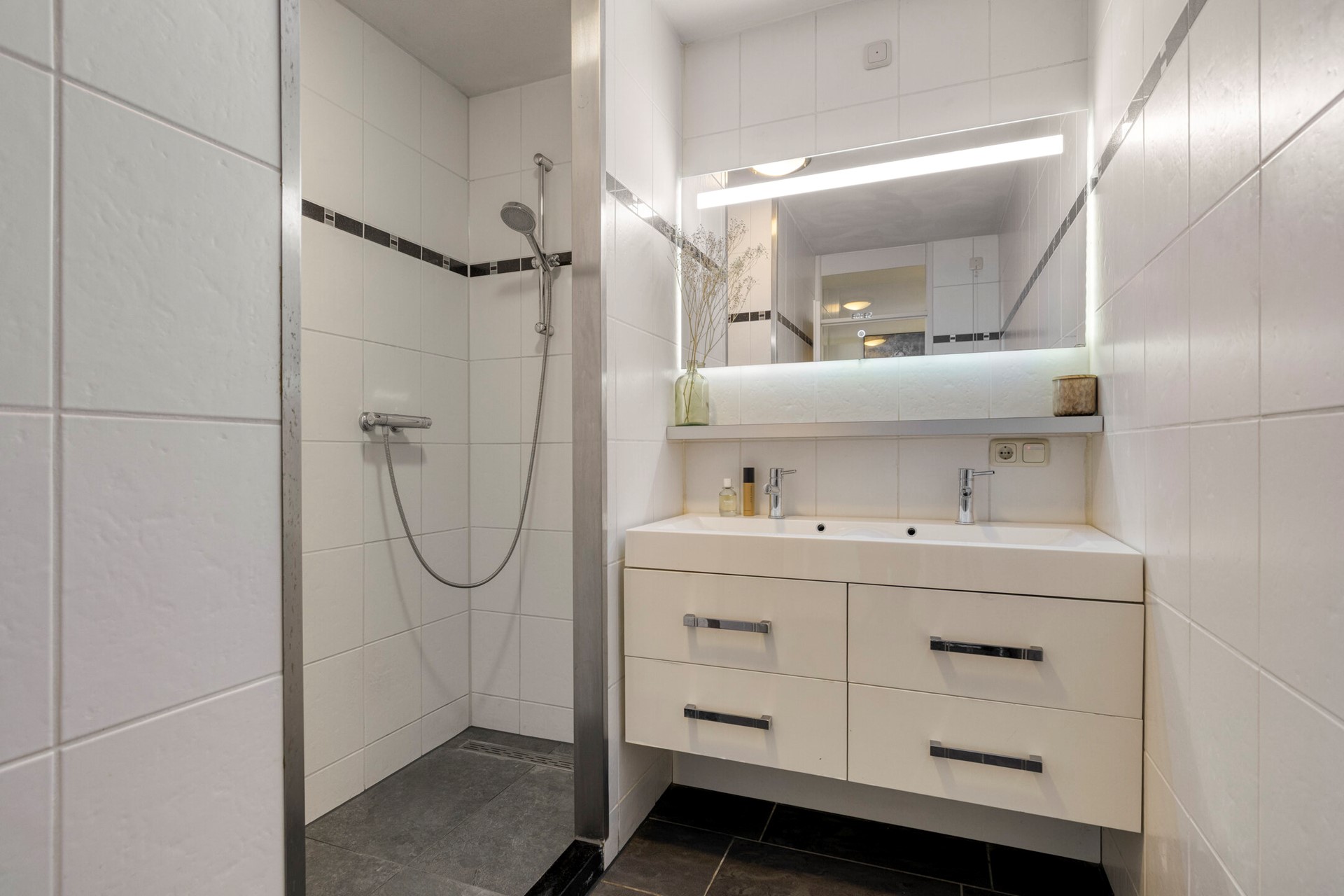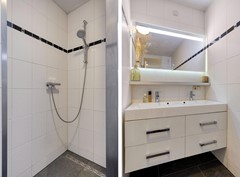 De badkamer is verzorgd en comfortabel ingericht met een dubbele wastafel en een moderne inloopdouche — een fijne plek om de dag rustig te beginnen of ontspannen af te sluiten. De inpandige berging is allesbehalve een standaard berging. Hier vind je niet alleen de aansluiting voor de wasmachine, maar ook een ingebouwde vriezer, een stijlvolle wijnkoeler en praktische ingebouwde kastruimte. Functionaliteit en luxe komen hier verrassend mooi samen.